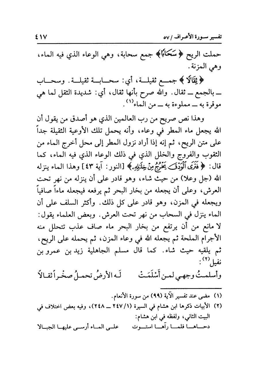 وهذا نَصٌّ صريحٌ من رَبِّ العالمين الذي هو أصدقُ مَنْ يقولُ أن اللَّهَ يجعلُ ماءَ المطرِ في وعاءٍ، وأنه يحملُ تلك الأوعيةَ الثقيلةَ جِدًّا على متنِ الريحِ، ثم إنه إذا أرادَ نزولَ المطرِ إلى مَحَلٍّ أخرجَ الماءَ من الثقوبِ والفروجِ والخللِ الذي في تلك الوعاءِ الذي فيه الماءُ، كما قال: {فَتَرَى الْوَدْقَ يَخْرُجُ مِنْ خِلَالِهِ} [النور: آية ٤٣] وهذا الماءُ يُنْزِلُهُ اللَّهُ (جل وعلا) من حيثُ شاءَ، وهو قادرٌ على أن ينزلَه من نَهْرٍ تحتَ العرشِ، وعلى أن يجعلَه من بخارِ البحرِ ثم يرفعُه فيجعلُه ماءً صافيًا ويجعله في الْمُزْنِ، وهو قادرٌ على كُلِّ ذلك. وأكثرُ السلفِ على أن الماءَ ينزلُ في السحابِ من نهرٍ تحتَ العرشِ. وبعضُ العلماءِ يقولُ: لَا مانعَ من أن يرتفعَ من بخارِ البحرِ ماءٌ صَافٍ عذبٌ تتحلل منه الأجرامُ الملحةُ ثم يجعلُه اللَّهُ في وعاءِ الْمُزْنِ، ثم يحملُه على الريحِ، ثم يُلْقِيهِ حيث شاءَ. كما قال مسلم الجاهلية زيدُ بنُ عمرِو بنِ نُفَيْلٍ (¬٢):