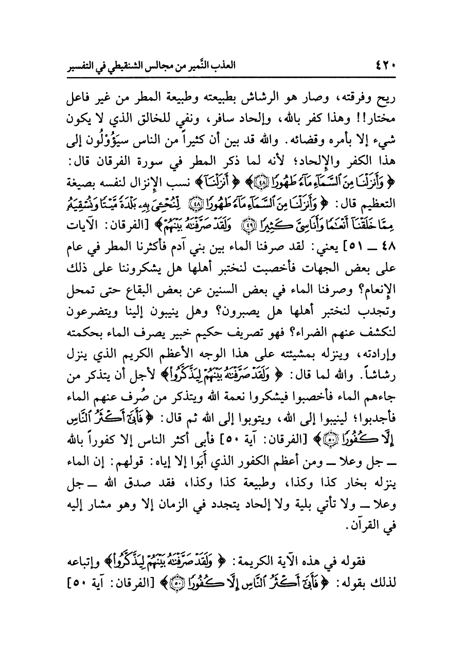والله لَمَّا قال: {وَلَقَدْ صَرَّفْنَاهُ بَيْنَهُمْ لِيَذَّكَّرُوا} لأَجْلِ أن يتذكرَ مَنْ جاءهم الماءُ فأخصبوا فيشكروا نعمةَ اللَّهِ ويتذكر مَنْ صُرِفَ عنهم الماءُ فأجدبوا؛ لِيُنِيبُوا إلى اللَّهِ، ويتوبوا إلى اللَّهِ ثم قال: {فَأَبَى أَكْثَرُ النَّاسِ إِلَاّ كُفُورًا} [الفرقان: آية ٥٠] فَأَبَى أكثرُ الناسِ إلا كفورًا بالله - جل وعلا - وَمِنْ أعظمِ الكفورِ الذي أَبَوْا إلا إياه: قولُهم: إن الماءَ يُنْزِلُهُ بخارُ كذا وكذا، وطبيعةُ كذا وكذا، فقد صَدَقَ اللَّهُ - جل وعلا - ولا تأتِي بليةٌ ولا إلحادٌ يتجددُ في الزمانِ إلا وهو مُشَارٌ إليه في القرآنِ.