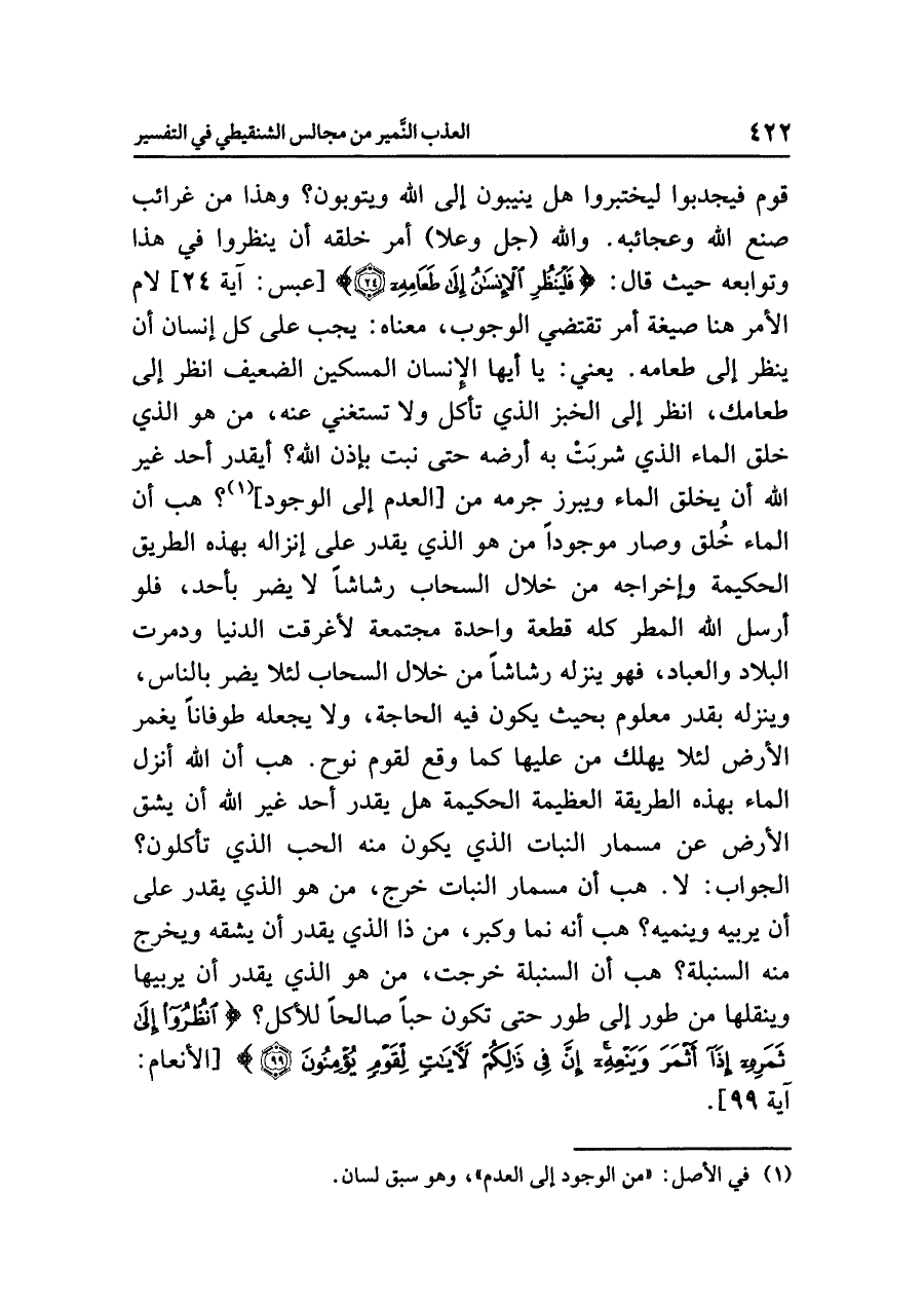 قومٍ فيجدبوا ليختبروا هل يُنِيبُونَ إلى الله ويتوبونَ؟ وهذا من غرائبِ صُنْعِ الله وعجائبِه. واللَّهُ (جل وعلا) أَمَرَ خلقَه أن ينظروا في هذا وتوابعِه حيث قال: {فَلْيَنظُرِ الْإِنْسَانُ إِلَى طَعَامِهِ (٢٤)} [عبس: آية ٢٤] لَامُ الأَمْرِ هنا صيغةُ أمرٍ تقتضي الوجوبَ، معناه: يجبُ على كُلِّ إنسانٍ أن ينظرَ إلى طعامِه. يعني: يا أيها الإنسانُ المسكينُ الضعيفُ انْظُرْ إلى طعامِك، انظر إلى الخبزِ الذي تأكلُ ولَا تستغنِي عنه، مَنْ هو الذي خَلَقَ الماءَ الذي شَرِبَتْ به أرضُه حتى نَبَتَ بإذن اللهِ؟ أيقدرُ أحدٌ غيرُ اللهِ أن يخلقَ الماءَ ويبرزَ جرمَه من [العدمِ إلى الوجودِ] (¬١)؟ هَبْ أن الماءَ خُلِقَ وصارَ موجودًا مَنْ هو الذي يَقْدِرُ على إنزالِه بهذه الطريقِ الحكيمةِ وإخراجِه من خلالِ السحابِ رشاشًا لا يضرُّ بأحدٍ، فلو أَرْسَلَ اللهُ المطرَ كلَّه قطعةً واحدةً مجتمعةً لأَغْرَقَتِ الدنيا ودمرت البلادَ والعبادَ، فهو يُنْزِلُهُ رشاشًا من خلالِ السحابِ لئلا يضرَّ بالناسِ، وينزلُه بِقَدَرٍ معلومٍ بحيث يكونُ فيه الحاجةُ، ولا يجعلُه طوفانًا يغمرُ الأرضَ لئلَاّ يُهْلِكَ مَنْ عليها كما وَقَعَ لقومِ نوحٍ. هَبْ أن اللهَ أَنْزَلَ الماءَ بهذه الطريقةِ العظيمةِ الحكيمةِ هل يقدرُ أحدٌ غيرُ اللهِ أن يشقَّ الأرضَ عن مسمارِ النباتِ الذي يكونُ منه الْحَبُّ الذي تأكلون؟