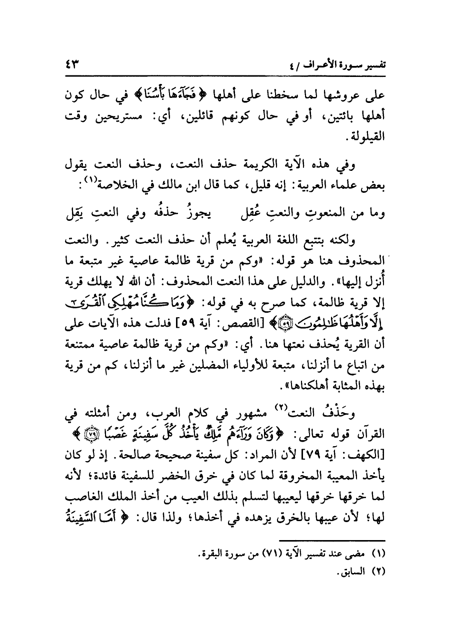 وحَذفُ النعت (¬٢) مشهور في كلام العرب، ومن أمثلته في القرآن قوله تعالى: {وَكَانَ وَرَاءهُم مَّلِكٌ يَأْخُذُ كُلَّ سَفِينَةٍ غَصْباً (٧٩)} [الكهف: آية ٧٩] لأن المراد كل سفينة صحيحة صالحة؛ إذ لو كان يأخذ المعِيبَة المَخْرُوقَة لما كان في خرق الخضر للسفينة فائدة؛ لأنه لما خرقها خرقها ليعيبها لتسلم بذلك العيب من أخذ الملك الغاصب لها؛ لأن عيبها بالخرق يزهده في أخذها؛ ولذا قال: {أَمَّا السَّفِينَةُ