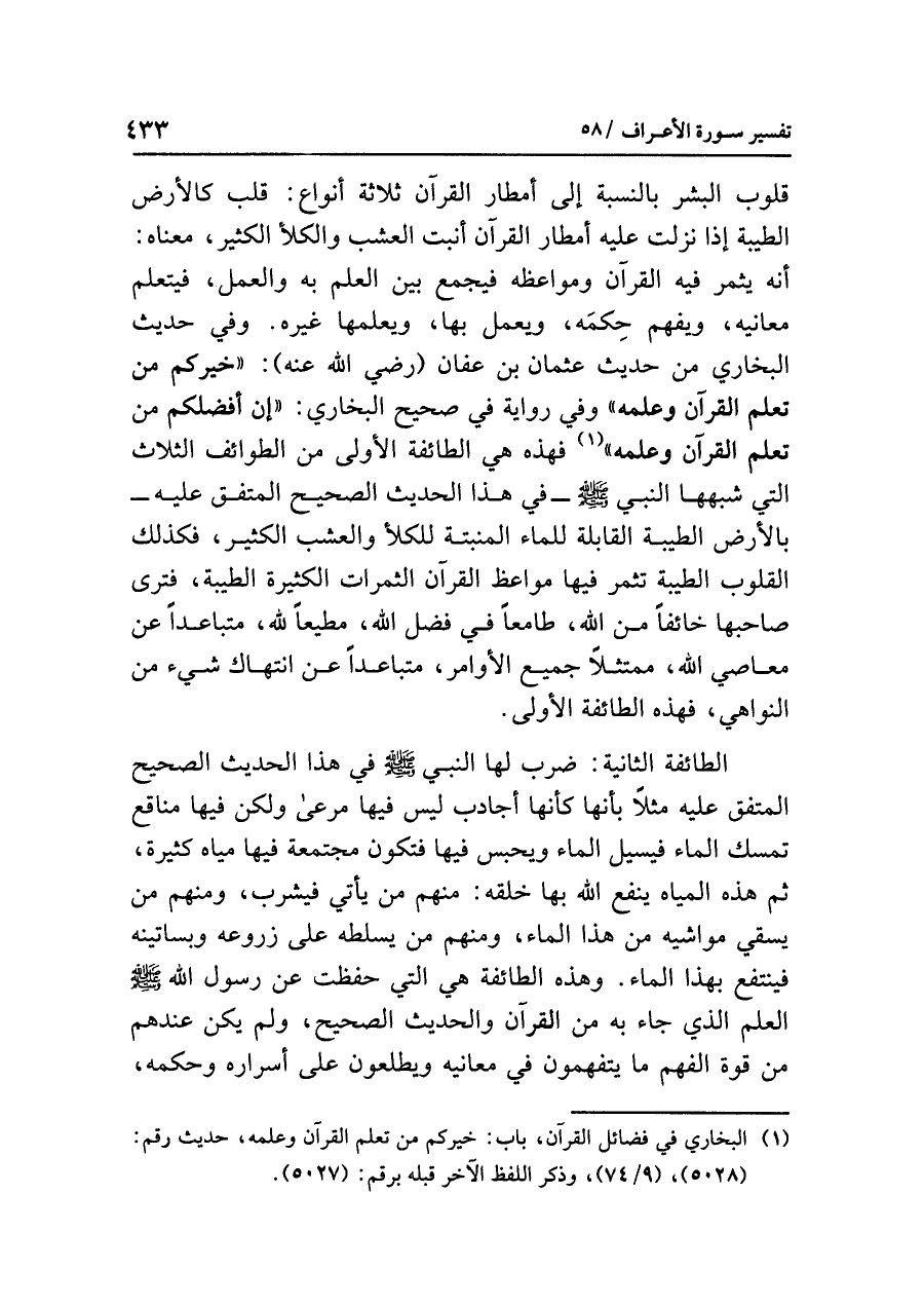 قلوبَ البشرِ بالنسبةِ إلى أمطارِ القرآنِ ثلاثةُ أنواعٍ: قلبٌ كالأرضِ الطيبةِ إذا نزلت عليه أمطارُ القرآنِ أَنْبَتَ العشبَ والكلأَ الكثيرَ، معناه: أنه يثمرُ فيه القرآنُ ومواعظُه فيجمعُ بينَ العلمِ به والعملِ، فيتعلمُ معانيه، ويفهمُ حِكمَه، ويعملُ بها، وَيُعَلِّمُهَا غيرَه. وفي حديثِ البخاريِّ من حديثِ عثمانَ بنِ عفانَ (رضي الله عنه): «خَيْرُكُمْ مَنْ تَعَلَّمَ الْقُرْآنَ وَعَلَّمَهُ» وفي روايةٍ في صحيحِ البخاريِّ: «إِنَّ أَفْضَلَكُمْ مَنْ تَعَلَّمَ الْقُرْآنَ وَعَلَّمَهُ» (¬١) فهذه هي الطائفةُ الأُولَى من الطوائفِ الثلاثةِ التي شَبَّهَهَا النبيُّ صلى الله عليه وسلم - في هذا الحديثِ الصحيحِ المتفقِ عليه - بالأرضِ الطيبةِ القابلةِ للماءِ الْمُنْبِتَةِ للكلأِ والعشبِ الكثيرِ، فكذلك القلوبُ الطيبةُ تُثْمِرُ فيها مواعظُ القرآنِ الثمراتِ الكثيرةَ الطيبةَ، فترى صاحبَها خائفًا من اللهِ، طَامِعًا في فَضْلِ اللهِ، مُطِيعًا لِلَّهِ، مُتَبَاعِدًا عن معاصِي اللهِ، مُمْتَثِلاً جميعَ الأوامرِ، مُتَبَاعِدًا عن انتهاكِ شيءٍ من النواهِي، فهذه الطائفةُ الأُولَى.