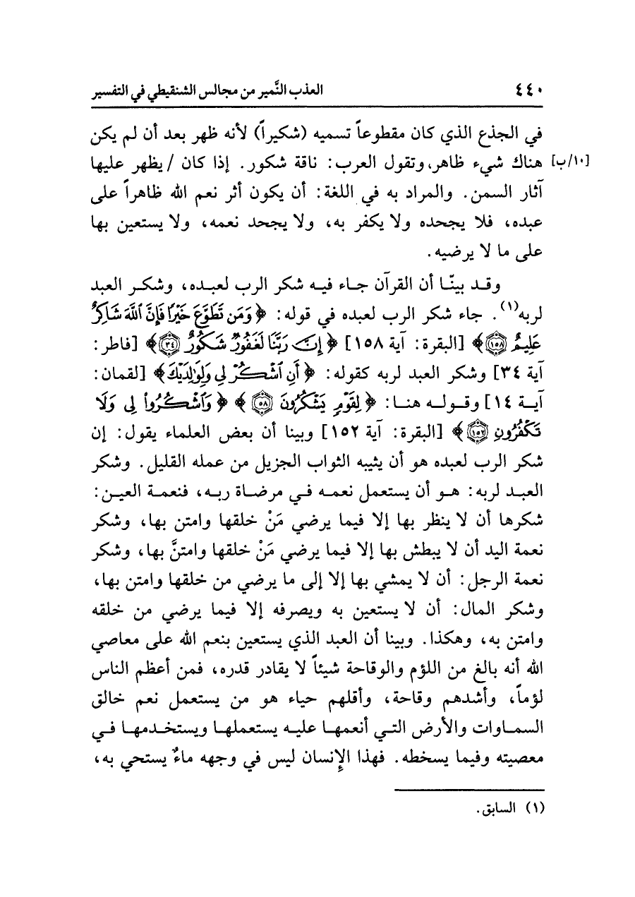 في الجذعِ الذي كان مقطوعًا تُسَمِّيه (شكيرًا) لأنه ظَهَرَ [١٠/ ب] بعدَ أن لم يكن هناك شيءٌ ظاهرٌ، وتقول العربُ: ناقةٌ شكورٌ. إذا كان / يظهرُ عليها آثارُ السِّمَنِ. والمرادُ به في اللغةِ: أن يكونَ أثرُ نِعَمِ اللَّهِ ظاهرًا على عَبْدِهِ، فلَا يجحدُه ولا يكفرُ به، ولَا يجحدُ نِعَمَهُ، ولا يستعينُ بها على ما لا يُرْضِيهِ.