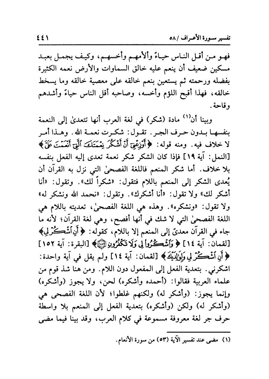 وَبَيَّنَّا أن (¬١) مادةَ (شكر) في لغةِ العربِ أنها تتعدى إلى النعمةِ بنفسِها بدونِ حرفِ الجرِّ. تقولُ: شكرتُ نعمةَ اللهِ. وهذا أمرٌ لا خلافَ فيه. ومنه قولُه: {أَوْزِعْنِي أَنْ أَشْكُرَ نِعْمَتَكَ الَّتِي أَنْعَمْتَ عَلَيَّ} [النمل: آية ١٩] فإذا كان الشكرُ شكرَ نعمةٍ تَعَدَّى إليه الفعلُ بنفسِه بِلَا خلافٍ. أما شكرُ المنعمِ فاللغةُ الفصحى التي نَزَلَ به القرآنُ أن يُعَدَّى الشكرُ إلى المنعمِ باللامِ فتقولُ: «شُكْرًا لك». وتقولُ: «أنا أشكرُ لَكَ» ولَا تقول: «أنا أَشْكُرُكَ». وتقول: «نحمدُ اللهَ ونشكرُ له» ولا تقول: «ونشكره». وهذه هي اللغةُ الفصحى، تعديتُه باللامِ هي اللغةُ الفصحى التي لا شكَّ في أنها أفصحُ، وهي لغةُ القرآنِ؛ لأنه ما جاء في القرآنِ مُعَدًّى إلى المنعمِ إلا باللامِ، كقولِه: {أَنِ اشْكُرْ لِي} [لقمان: آية ١٤] {وَاشْكُرُوا لِي وَلَا تَكْفُرُونِ} [البقرة: آية ١٥٢] {أَنِ اشْكُرْ لِي وَلِوَالِدَيْكَ} [لقمان: آية ١٤] ولم يَقُلْ في آيةٍ واحدةٍ: اشكرني. بتعديةِ الفعلِ إلى المفعولِ دونَ اللامِ. ومن هنا شَذَّ قومٌ من علماءِ العربيةِ فقالوا: (أحمدُه وأشكرُه) لَحْنٌ، ولا يجوزُ (وأشكره) وإنما يجوزُ: (وأشكر له) ولكنهم غلطوا؛ لأن اللغةَ الفصحى هي (وأشكر له) ولكن (وأشكره) بتعديةِ الفعلِ إلى المنعمِ بلَا واسطةِ حرفِ جرٍّ لغةٌ معروفةٌ مسموعةٌ في كلامِ العربِ، وقد بَيَّنَّا فيما مضى