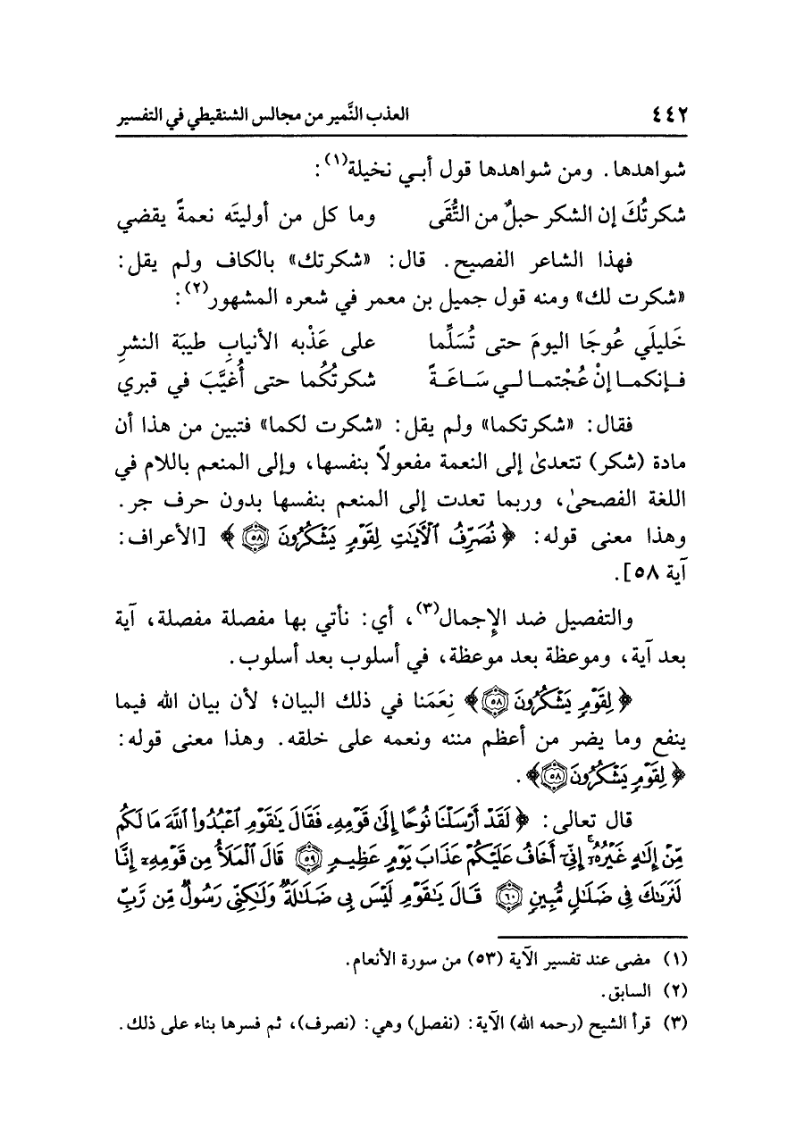 فقال: «شكرتُكما» ولم يَقُلْ: «شكرتُ لكما» فَتَبَيَّنَ من هذا أن مادةَ (شكر) تَتَعَدَّى إلى النعمةِ مفعولاً بنفسها، وإلى المنعمِ باللامِ في اللغةِ الفصحى، وربما تَعَدَّتْ إلى المنعمِ بنفسِها بدونِ حرفِ جَرٍّ. وهذا معنَى قولِه: {نُصَرِّفُ الآيَاتِ لِقَوْمٍ يَشْكُرُونَ} [الأعراف: آية ١٥٨].