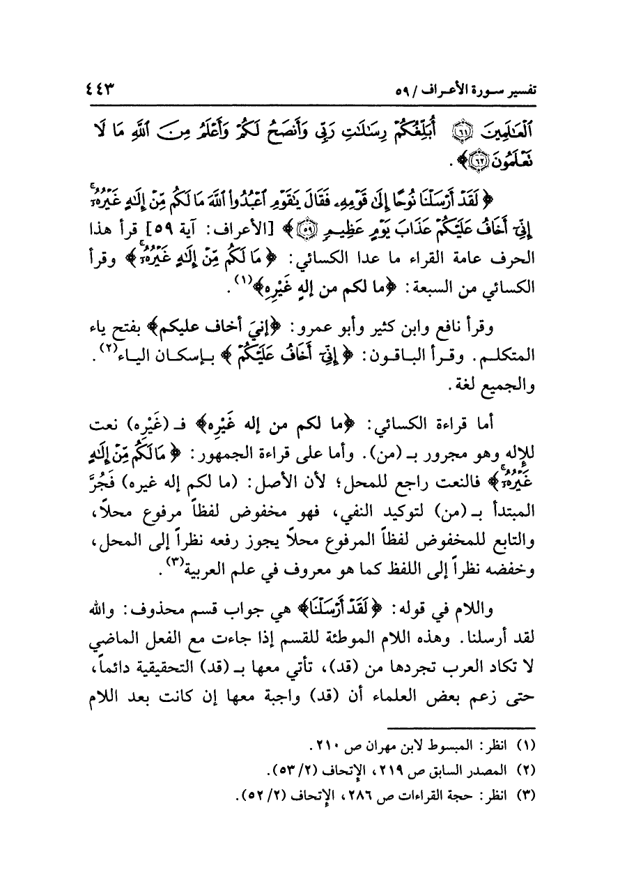 {لَقَدْ أَرْسَلْنَا نُوحًا إِلَى قَوْمِهِ فَقَالَ يَا قَوْمِ اعْبُدُوا اللَّهَ مَا لَكُم مِّنْ إِلَهٍ غَيْرُهُ إِنِّيَ أَخَافُ عَلَيْكُمْ عَذَابَ يَوْمٍ عَظِيمٍ (٥٩)} [الأعراف: آية ٥٩] قَرَأَ هذا الحرفَ عامةُ القراءِ ما عدا الكسائيَّ: {مَا لَكُم مِّنْ إِلَهٍ غَيْرُهِ} وَقَرَأَ الكسائيُّ من السبعةِ: {ما لكم من إلهٍ غَيْرهِ} (¬١).