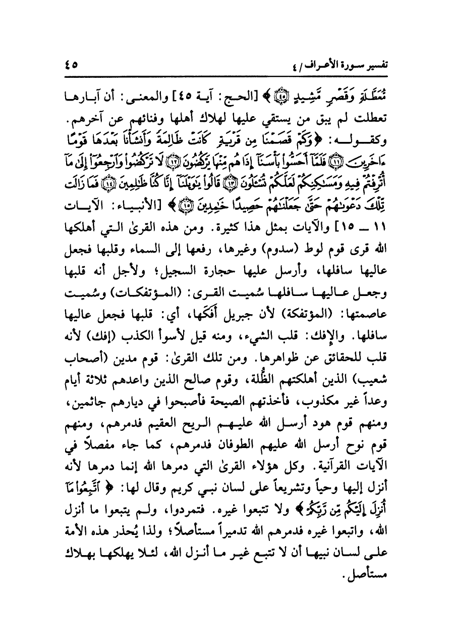 مُّعَطَّلَةٍ وَقَصْرٍ مَّشِيدٍ (٤٥)} [الحج: آية ٤٥] والمعنى: أن آبارها تعطلت لم يبق من يستقي عليها لهلاك أهلها وفنائهم عن آخرهم. وكقوله: {وَكَمْ قَصَمْنَا مِن قَرْيَةٍ كَانَتْ ظَالِمَةً وَأَنشَأْنَا بَعْدَهَا قَوْماً آخَرِينَ (١١) فَلَمَّا أَحَسُّوا بَأْسَنَا إِذَا هُم مِّنْهَا يَرْكُضُونَ (١٢) لَا تَرْكُضُوا وَارْجِعُوا إِلَى مَا أُتْرِفْتُمْ فِيهِ وَمَسَاكِنِكُمْ لَعَلَّكُمْ تُسْأَلُونَ (١٣) قَالُوا يَا وَيْلَنَا إِنَّا كُنَّا ظَالِمِينَ (١٤) فَمَا زَالَت تِّلْكَ دَعْوَاهُمْ حَتَّى جَعَلْنَاهُمْ حَصِيداً خَامِدِينَ (١٥)} [الأنبياء: الآيات ١١ - ١٥] والآيات بمثل هذا كثيرة. ومن هذه القرى التي أهلكها الله قرى قوم لوط (سدوم) وغيرها، رفعها إلى السماء وقلبها فجعل عاليها سافلها، وأرسل عليها حجارة السجيل؛ ولأجل أنه قلبها وجعل عاليها سافلها سُميت القرى: (المؤتفكات) وسُميت عاصمتها: (المؤتفكة) لأن جبريل أَفَكَها، أي: قلبها فجعل عاليها سافلها. والإفك: قلب الشيء، ومنه قيل لأسوأ الكذب (إفك) لأنه قلب للحقائق عن ظواهرها. ومن تلك القرى: قوم مدين (أصحاب شعيب) الذين أهلكتهم الظُّلة، وقوم صالح الذين واعدهم ثلاثة أيام وعداً غير مكذوب، فأخذتهم الصيحة فأصبحوا في ديارهم جاثمين، ومنهم قوم هود أرسل الله عليهم الريح العقيم فَدَمَّرهُم، ومنهم قوم نوح أرسل الله عليهم الطوفان فدَمَّرَهم، كما جاء مفصلاً في الآيات القرآنية.