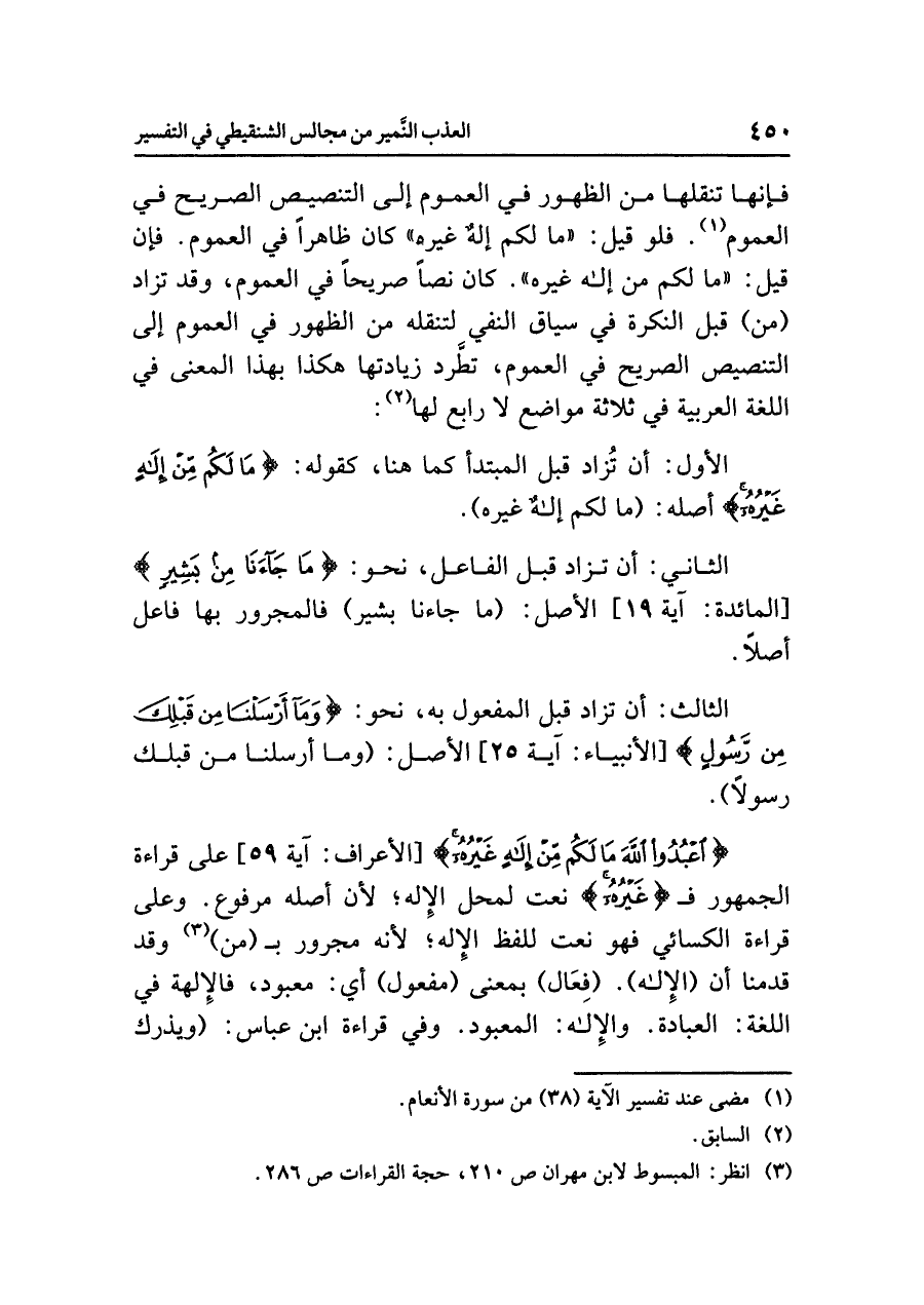 فإنها تنقلُها من الظهورِ في العمومِ إلى التنصيصِ الصريحِ في العمومِ (¬١). فلو قيل: «ما لكم إلهٌ غيره» كان ظاهرًا في العمومِ. فإن قيل: «ما لكم من إله غيره». كان نصًّا صريحًا في العمومِ، وقد تُزَادُ (مِنْ) قبلَ النكرةِ في سياقِ النفيِ لتنقلَه من الظهورِ في العمومِ إلى التنصيصِ الصريحِ في العمومِ، تَطَّرِدُ زِيَادَتُهَا هكذا بهذا المعنَى في اللغةِ العربيةِ في ثلاثةِ مواضعَ لَا رابعَ لها (¬٢):