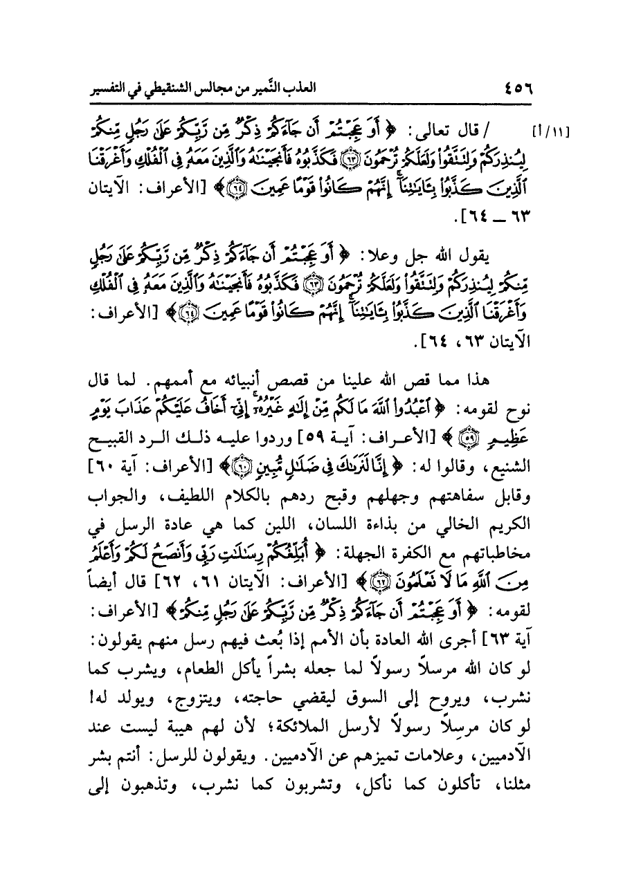 هذا مما قَصَّ اللهُ علينا من قصصِ أنبيائِه مع أُمَمِهِمْ. لَمَّا قال نوحٌ لقومِه: {اعْبُدُوا اللَّهَ مَا لَكُم مِّنْ إِلَهٍ غَيْرُهُ إِنِّي أَخَافُ عَلَيْكُمْ عَذَابَ يَوْمٍ عَظِيمٍ} [الأعراف: آية ٥٩] وَرَدُّوا عليه ذلك الردَّ القبيحَ الشنيعَ، وقالوا له: {إِنَّا لَنَرَاكَ فِي ضَلَالٍ مُّبِينٍ} [الأعراف: آية ٦٠] وقابل سفاهتَهم وَجَهْلَهُمْ وَقُبْحَ رَدِّهِمْ بالكلامِ اللطيفِ، والجوابِ الكريمِ الخالِي من بذاءةِ اللسانِ، اللَّيِّنِ كما هي عادةُ الرسلِ في مخاطباتِهم مع الكفرةِ الجهلةِ: {قَالَ يَا قَوْمِ لَيْسَ بِي ضَلَالَةٌ وَلَكِنِّي رَسُولٌ مِّن رَّبِّ الْعَالَمِينَ (٦١) أُبَلِّغُكُمْ رِسَالَاتِ رَبِّي وَأَنْصَحُ لَكُمْ وَأَعْلَمُ مِنَ اللَّهِ مَا لَا تَعْلَمُونَ (٦٢)} [الأعراف: الآيتان ٦١، ٦٢] قال أيضًا لقومِه: {أَوَعَجِبْتُمْ أَنْ جَاءَكُمْ ذِكْرٌ مِّن رَّبِّكُمْ عَلَى رَجُلٍ مِّنْكُمْ} [الأعراف: آية ٦٣] أَجْرَى اللهُ العادةَ بأن الأممَ إذا بُعِثَ فيهم رُسُلٌ منهم يقولونَ: لو كان اللَّهُ مُرْسِلاً رسولاً لَمَا جَعَلَهُ بَشَرًا يأكلُ الطعامَ، ويشربُ كما نشربُ، ويروحُ إلى السوقِ ليقضيَ حاجتَه، ويتزوجُ، ويولدُ له! لو كان مُرْسِلاً رسولاً لأَرْسَلَ الملائكةَ؛ لأَنَّ لهم هيبةً ليست عندَ الآدَمِيِّينَ، وعلاماتٍ تميزهم عن الآدميين. ويقولونَ للرسلِ: أنتم بشرٌ مثلُنا، تأكلونَ كما نأكلُ، وتشربونَ كما نشربُ، وتذهبونَ إلى