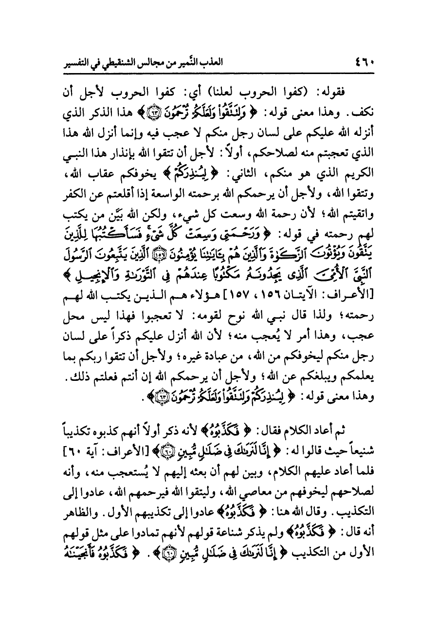 فقولُه: (كُفُّوا الحروبَ لعلنا) أي: كُفُّوا الحروبَ لأَجْلِ أن نَكُفَّ. وهذا معنَى قولِه: {وَلِتَتَّقُوا وَلَعَلَّكُمْ تُرْحَمُونَ} هذا الذِّكْرُ الذي أَنْزَلَهُ اللهُ عليكم على لسانِ رجلٍ منكم لا عجبَ فيه وإنما أنزل اللهُ هذا الذي تعجبتُم منه لصلاحِكم: