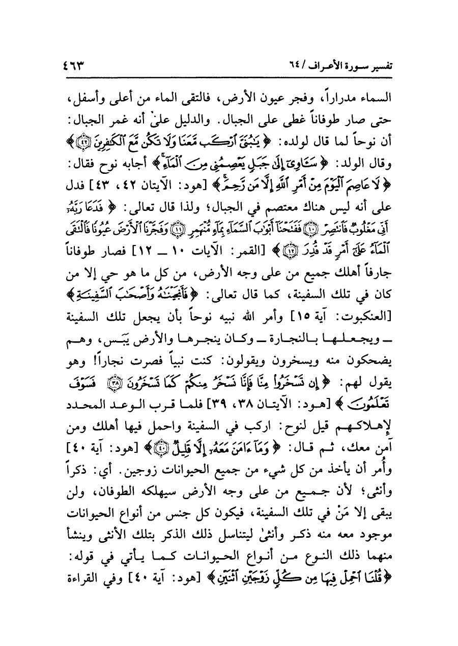 السماءَ مِدْرَارًا، وَفَجَّرَ عيونَ الأرضِ، فَالْتَقَى الماءُ من أعلى وأسفلَ، حتى صارَ طُوفَانًا غَطَّى على الجبالِ. والدليلُ على أنه غَمَرَ الجبالَ: أن نوحًا لَمَّا قال لولدِه: {يَا بُنَيَّ ارْكَب مَّعَنَا وَلَا تَكُن مَّعَ الْكَافِرِينَ} وقال الولدُ: {سَآوِي إِلَى جَبَلٍ يَعْصِمُنِي مِنَ الْمَاءِ} أجابَه نوحٌ فقال: {لَا عَاصِمَ الْيَوْمَ مِنْ أَمْرِ اللَّهِ إِلَاّ مَن رَّحِمَ} [هود: الآيتان ٤٢، ٤٣] فَدَلَّ على أنه ليسَ هناك معتصمٌ في الجبالِ؛ وَلِذَا قال تعالى: {فَدَعَا رَبَّهُ أَنِّي مَغْلُوبٌ فَانْتَصِرْ (١٠) فَفَتَحْنَا أَبْوَابَ السَّمَاءِ بِمَاءٍ مُّنْهَمِرٍ (١١) وَفَجَّرْنَا الْأَرْضَ عُيُونًا فَالْتَقَى الْمَاءُ عَلَى أَمْرٍ قَدْ قُدِرَ (١٢)} [القمر: الآيات ١٠ - ١٢] فصارَ طوفانًا جارفًا أَهْلَكَ جميعَ مَنْ على وجهِ الأرضِ، مِنْ كُلِّ ما هو حَيٌّ إلا مَنْ كان في تلك السفينةِ، كما قال تعالى: {فَأَنْجَيْنَاهُ وَأَصْحَابَ السَّفِينَةِ} [العنكبوت: آية ١٥] وأمر اللهُ نَبِيَّهُ نوحًا بأن يجعلَ تلك السفينةَ - ويجعلَها بالنجارةِ - وكان ينجرها والأرضُ يبَس، وهم يضحكونَ منه ويسخرونَ ويقولونَ: كنتَ نَبِيًّا فصرتَ نَجَّارًا! وهو يقولُ لهم: {إِنْ تَسْخَرُوا مِنَّا فَإِنَّا نَسْخَرُ مِنْكُمْ كَمَا تَسْخَرُونَ (٣٨) فَسَوْفَ تَعْلَمُونَ} [هود: الآيتان ٣٨، ٣٩] فَلَمَّا قَرُبَ الوعدُ المحددُ لإهلاكِهم قيلَ لنوحٍ: ارْكَبْ في السفينةِ وَاحْمِلْ فيها أهلكَ ومن آمَنَ مَعَكَ، ثم قال: {وَمَا آمَنَ مَعَهُ إِلَاّ قَلِيلٌ} [هود: آية ٤٠] وَأَمَرَ أن يأخذَ من كُلِّ شيءٍ من جميعِ الحيواناتِ زَوْجَيْنِ.