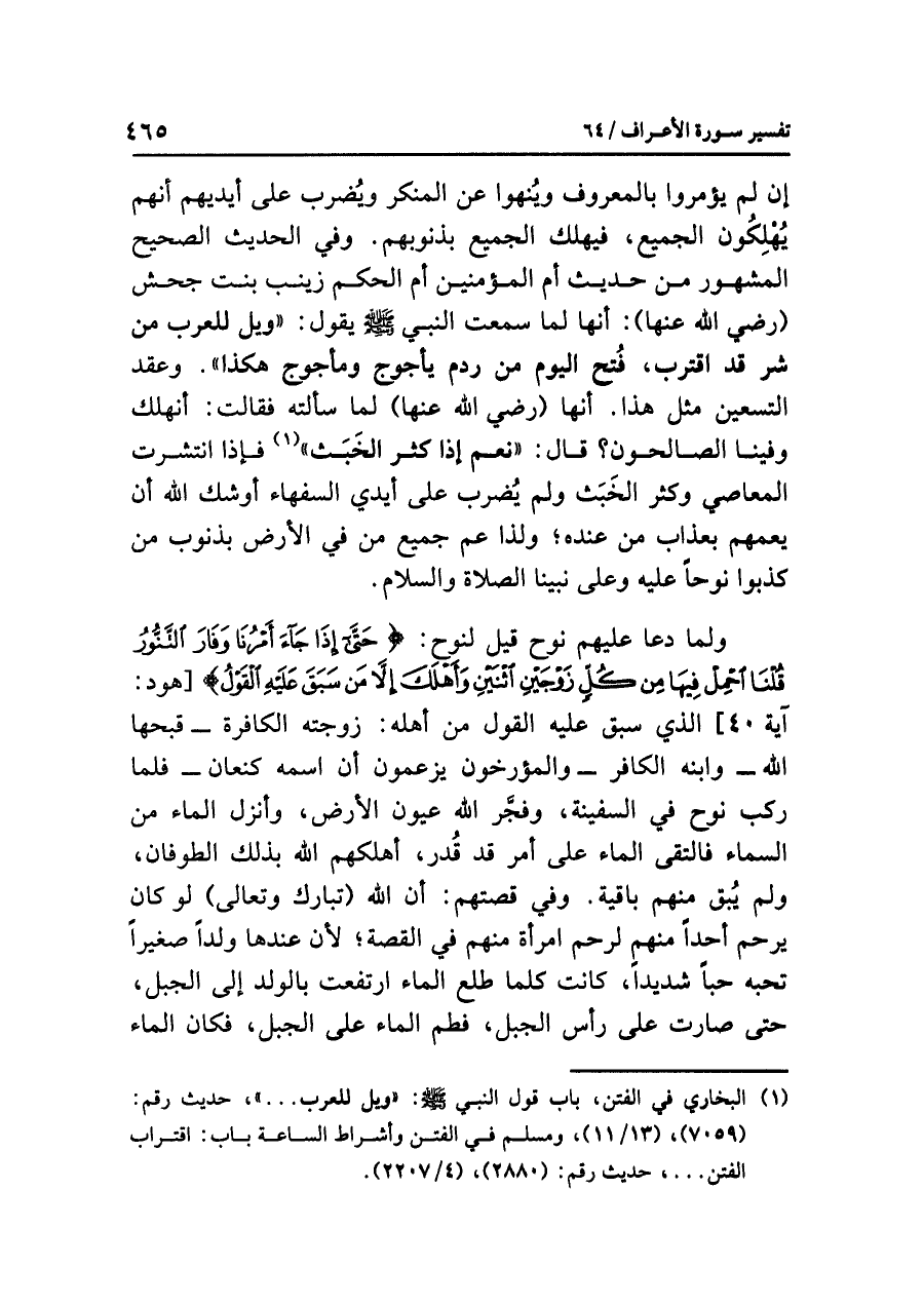 وفي الحديثِ الصحيحِ المشهورِ من حديثِ أُمِّ المؤمنينَ أُمِّ الحكمِ زينبَ بنتِ جحشٍ (رضي الله عنها): أنها لَمَّا سَمِعَتِ النبيَّ صلى الله عليه وسلم يقولُ: «وَيْلٌ لِلْعَرَبِ مِنْ شَرٍّ قَدِ اقْتَرَبَ، فُتِحَ الْيَوْمَ مِنْ رَدْمِ يَأْجُوجَ وَمَأْجُوجَ هَكَذَا». وعقدَ التسعينَ مثل هذا. أنها (رضي الله عنها) لَمَّا سَأَلَتْهُ فقالت: أَنَهْلِكُ وفينا الصالحونَ؟ قال: «نَعَمْ إِذَا كَثُرَ الْخَبَثُ» (¬١) فإذا انتشرت المعاصي وكثر الخَبَثُ ولم يُضرب على أيدي السفهاءِ أوشكَ اللهُ أن يعمهم بعذابٍ من عندِه؛ ولذا عَمَّ جميعَ مَنْ في الأرضِ بذنوبِ مَنْ كَذَّبُوا نوحًا عليه وعلى نبيِّنا الصلاةُ والسلامُ.