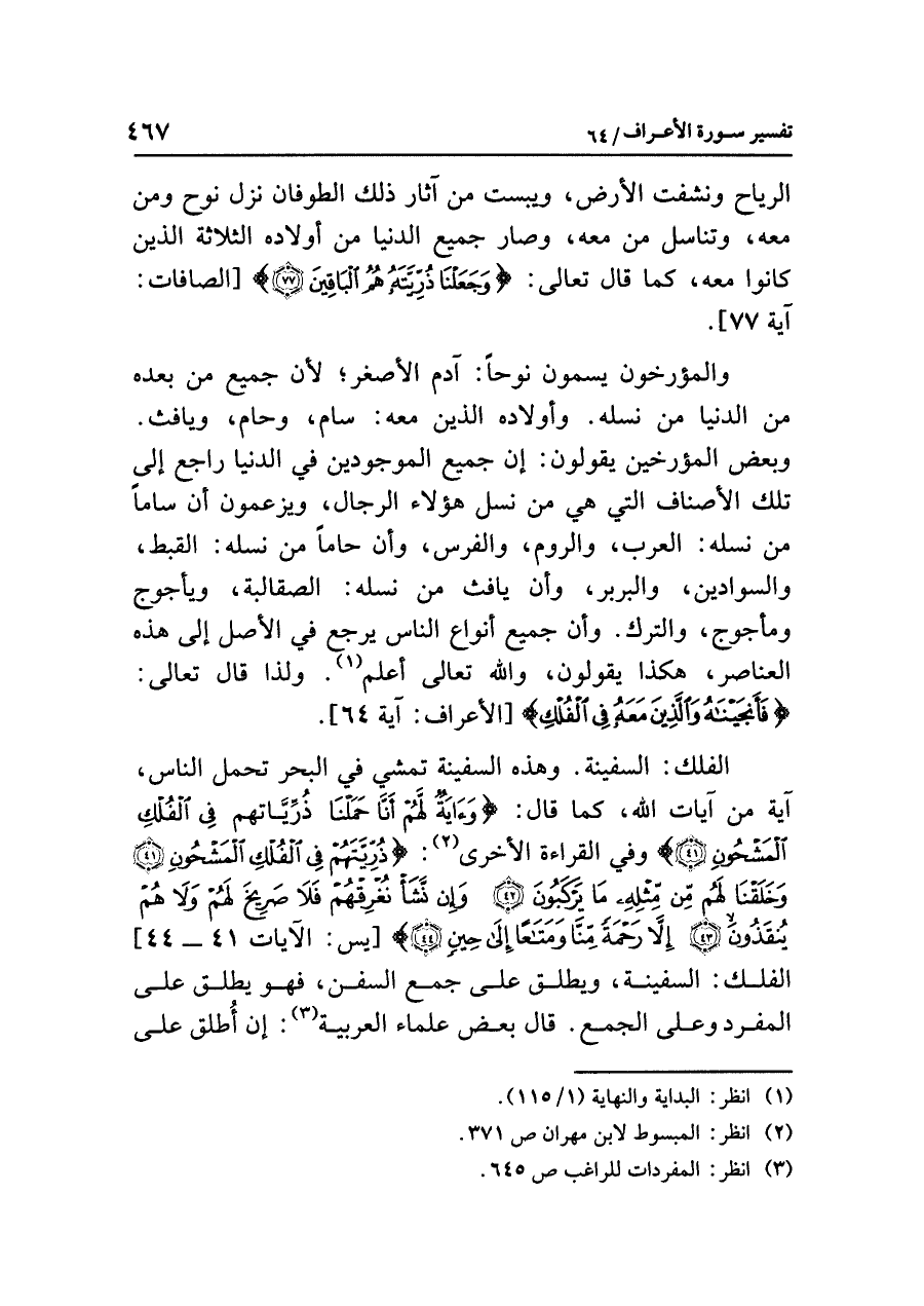 والمؤرخونَ يُسَمُّونَ نوحًا: آدمَ الأصغرَ؛ لأن جميعَ مَنْ بَعْدَهُ من الدنيا من نَسْلِهِ. وأولادُه الذين مَعَهُ: سام وحام ويافث. وبعضُ المؤرخين يقولونَ: إن جميعَ الموجودين في الدنيا راجعٌ إلى تلك الأصنافِ التي هِيَ مِنْ نسلِ هؤلاء الرجالِ، ويزعمونَ أن سَامًا من نسلِه: العربُ والرومُ والفرسُ، وأن حامًا من نسلِه: القبطُ والسوادين والبربرُ، وأن يافث من نسلِه: الصقالبةُ ويأجوجُ ومأجوجُ والتركُ. وأن جميعَ أنواعِ الناسِ يرجعُ في الأصلِ إلى هذه العناصرِ، هكذا يقولونَ، وَاللَّهُ تعالى أَعْلَمُ (¬١). وَلِذَا قال تعالى: {فَأَنْجَيْنَاهُ وَالَّذِينَ مَعَهُ فِي الْفُلْكِ} [الأعراف: آية ٦٤].