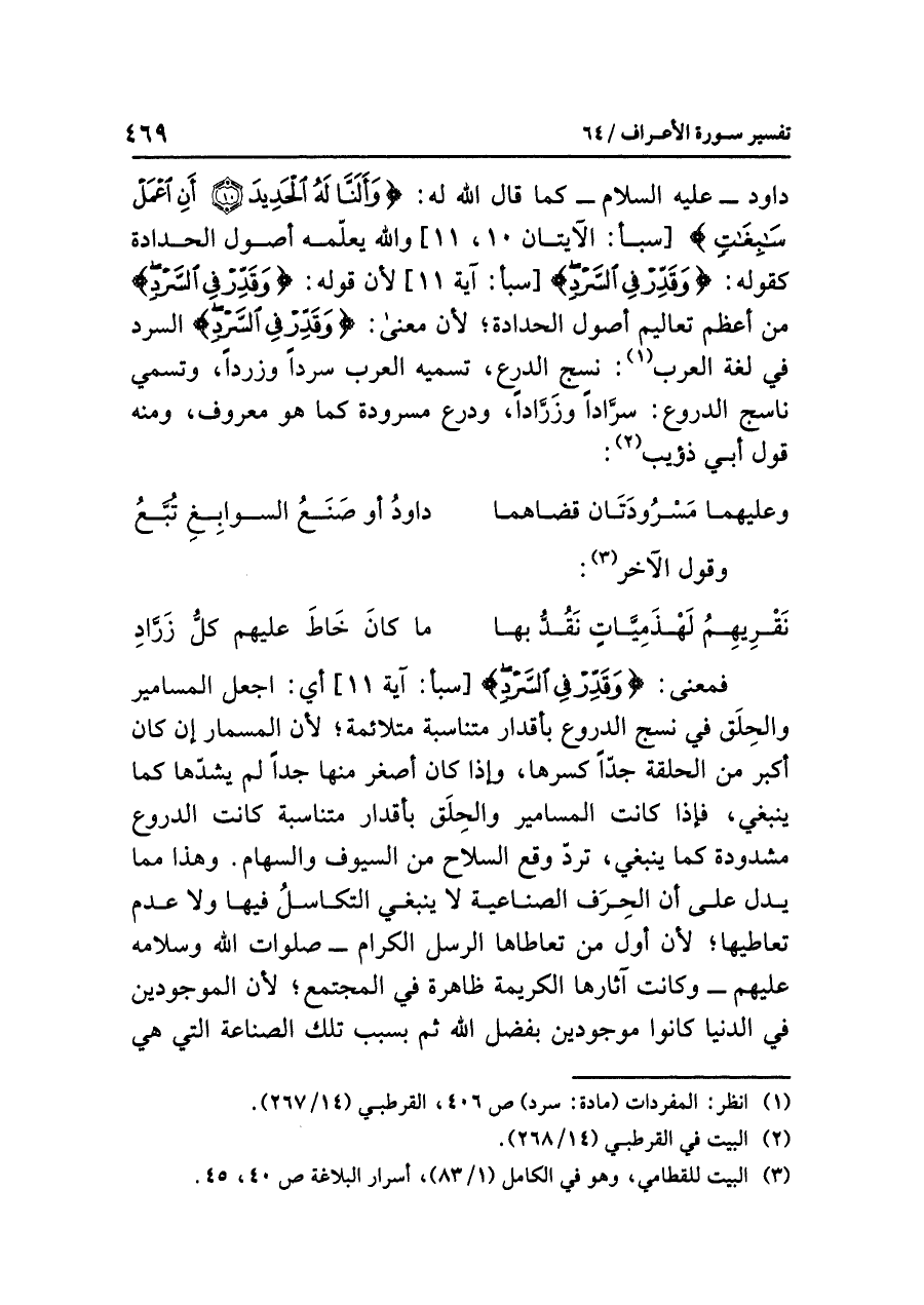 فمعنَى: {وَقَدِّرْ فِي السَّرْدِ} [سبأ: آية ١١] أي: اجْعَلِ المساميرَ والحِلَقَ في نسجِ الدروعِ بأقدارٍ متناسبةٍ متلائمةٍ؛ لأن المسمارَ إن كان أكبرَ من الحلقةِ جِدًّا كَسَرَهَا، وإذا كان أصغرَ منها جِدًّا لم يَشُدَّهَا كما ينبغي، فإذا كانت المساميرُ والحِلَقُ بأقدارٍ متناسبةٍ كانت الدروعُ مشدودةً كما ينبغي، تردُّ وقعَ السلاحِ من السيوفِ والسهامِ. وهذا مِمَّا يدلُّ على أن الحِرَفَ الصناعيةَ لَا ينبغي التكاسلُ فيها ولا عدمُ تعاطيها؛ لأن أولَ مَنْ تعاطاها الرسلُ الكرامُ - صلواتُ اللَّهِ وسلامُه عليهم - وكانت آثارُها الكريمةُ ظاهرةً في المجتمعِ؛ لأن الموجودين في الدنيا كانوا مَوْجُودِينَ بفضلِ اللَّهِ ثم بسببِ تلك الصناعةِ التي هي