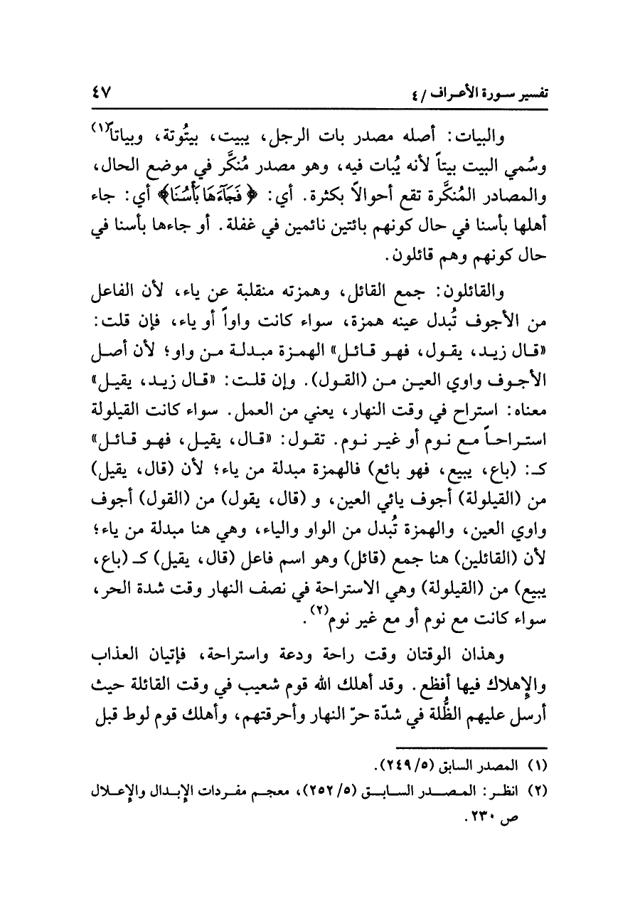 والقائلون: جمع القائل، وهمزته منقلبة عن ياء؛ لأن الفاعل من الأجوف تُبدل عينه همزة، سواء كانت واواً أو ياء، فإن قلت: قال زيد، يقول، فهو قائل، الهمزة مبدلة من واو؛ لأن أصل الأجوف واوي العين من (القول). وإن قلت: قال زيد، يقيل. معناه: استراح في وقت النهار، يعني من العمل، سواء كانت القيلولة استراحاً مع نوم أو غير نوم. تقول: قال، يقيل، فهو قائل، كـ: (باع، يبيع، فهو بائع) فالهمزة مبدلة من ياء؛ لأن (قال، يقيل) من (القيلولة) أجوف يائي العين، و (قال، يقول) من (القول) أجوف واوي العين، والهمزة تُبدل من الواو والياء، وهي هنا مبدلة من ياء؛ لأن (القائلين) هنا جمع (قائل) وهو اسم فاعل (قال، يقيل) كـ (باع، يبيع) من (القيلولة) وهي الاستراحة في نصف النهار وقت شدة الحر، سواء كانت مع نوم أو مع غير نوم (¬٢).