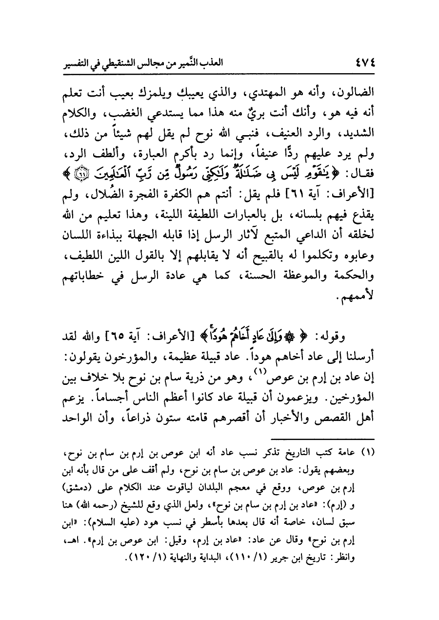(¬١) عامة كتب التاريخ تذكر نسب عاد أنه ابن عوص بن إرم بن سام بن نوح. وبعضهم يقول: عاد بن عوص بن سام بن نوح. ولم أقف على من قال بأنه ابن إرم بن عوص. ووقع في معجم البلدان لياقوت عند الكلام على (دمشق) و (إرم): «عاد بن إرم بن سام بن نوح». ولعل الذي وقع للشيخ (رحمه الله) هنا سبق لسان، خاصة أنه قال بعدها بأسطر في نسب هود (عليه السلام): «ابن إرم بن نوح» وقال عن عاد: «عاد بن إرم. وقيل: ابن عوص بن إرم» ا. هـ. وانظر: تاريخ ابن جرير (١/ ١١٠)، البداية والنهاية (١/ ١٢٠).