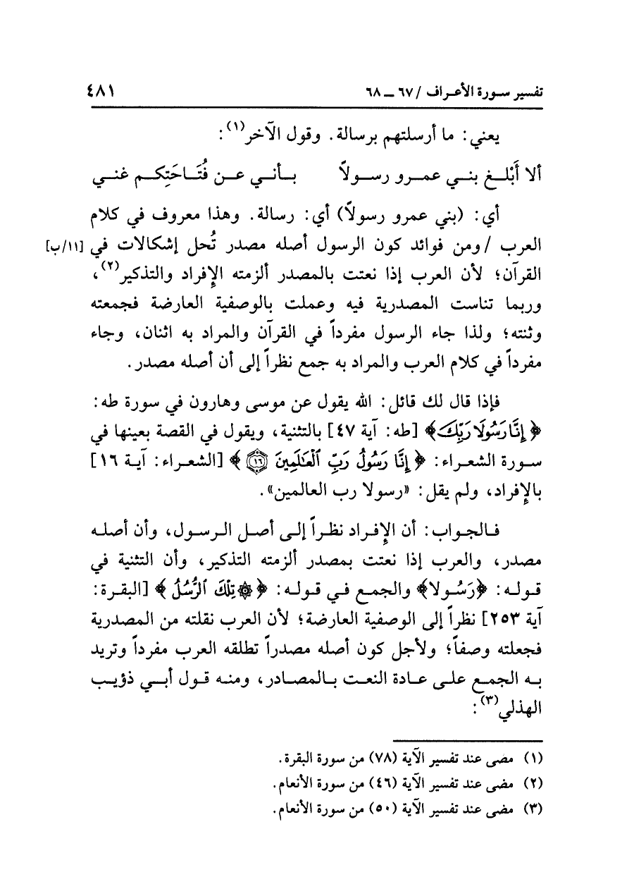 فالجوابُ: إن الإفرادَ نَظَرًا إلى أصلِ الرسولِ، وأن أصلَه مصدرٌ، والعربُ إذا نَعَتَتْ بمصدرٍ أَلْزَمَتْهُ التذكيرَ، وأن التثنيةَ في قولِه: {رَسُولَا} والجمعُ في قولِه: {تِلْكَ الرُّسُلُ} [البقرة: آية ٢٥٣] نظرًا إلى الوصفيةِ العارضةِ؛ لأن العربَ نَقَلَتْهُ من المصدريةِ فَجَعَلَتْهُ وصفًا؛ ولأجلِ كونِ أصلِه مصدرًا تُطْلِقُهُ العربُ مفردًا وتريدُ به الجمعَ على عادةِ النعتِ بالمصادرِ، ومنه قولُ أَبِي ذؤيبٍ الْهُذَلِيِّ (¬٣):