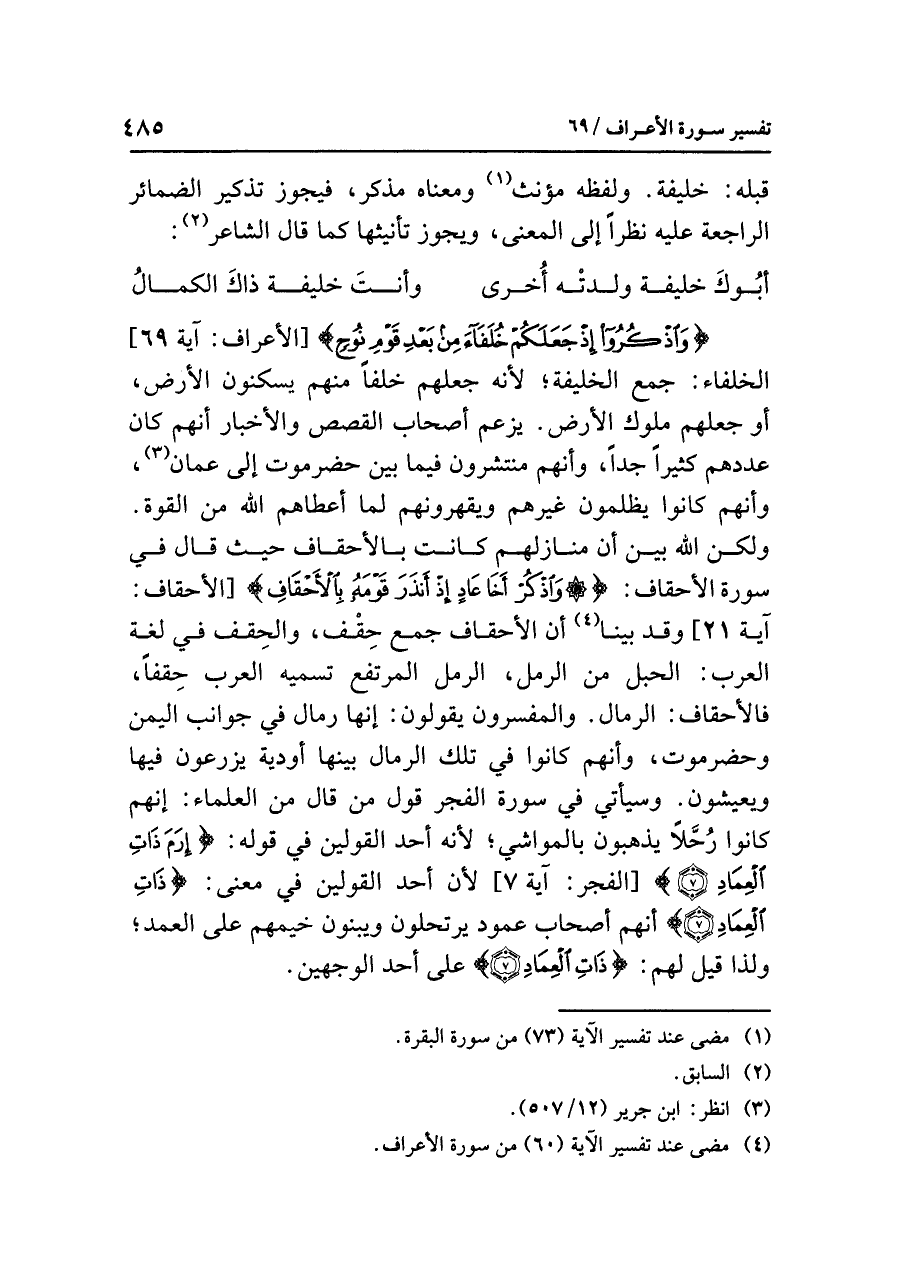 {وَاذْكُرُوا إِذْ جَعَلَكُمْ خُلَفَاءَ مِنْ بَعْدِ قَوْمِ نُوحٍ} [الأعراف: آية ٦٩] الخلفاءُ: جمعُ الخليفةِ؛ لأنه جَعَلَهُمْ خَلَفًا منهم يسكنونَ الأرضَ، أو جَعَلَهُمْ ملوكَ الأرضِ. يزعم أصحابُ القصصِ والأخبارِ أنهم كان عددُهم كثيرًا جِدًّا، وأنهم منتشرونَ فيما بينَ حضرموتَ إلى عمانَ (¬٣)، وأنهم كانوا يظلمونَ غيرَهم ويقهرونَهم لِمَا أعطاهم اللهُ من القوةِ. ولكن اللَّهَ بَيَّنَ أن منازلَهم كانت في الأحقافِ حيث قال في سورةِ الأحقافِ: {وَاذْكُرْ أَخَا عَادٍ إِذْ أَنْذَرَ قَوْمَهُ بِالْأَحْقَافِ} [الأحقاف: آية ٢١] وقد بَيَّنَّا (¬٤) أن الأحقافَ جمعُ حِقْفٍ، والحِقفُ في لغةِ العربِ: الحبلُ من الرملِ، الرملُ المرتفعُ تُسَمِّيهِ العربُ حِقفًا، فالأحقافُ: الرمالُ. والمفسرونَ يقولونَ: إنها رمالٌ في جوانبِ اليمنِ وحضرموتَ، وأنهم كانوا في تلك الرمالِ بينَها أوديةٌ يزرعونَ فيها ويعيشون. وسيأتِي في سورةِ الفجرِ قولُ مَنْ قال من العلماءِ: إنهم كانوا رُحَّلاً يذهبونَ بالمواشِي؛ لأنه أحدُ القولين في قولِه: {إِرَمَ ذَاتِ الْعِمَادِ (٧)} [الفجر: آية ٧] لأن أحدَ القولين في معنىَ: {ذَاتِ الْعِمَادِ} أنهم أصحابُ عمودٍ يرتحلونَ وَيَبْنُونَ خيمهم على العمدِ؛ ولذا قيل لهم: {ذَاتِ الْعِمَادِ} على أحدِ الوجهين.
