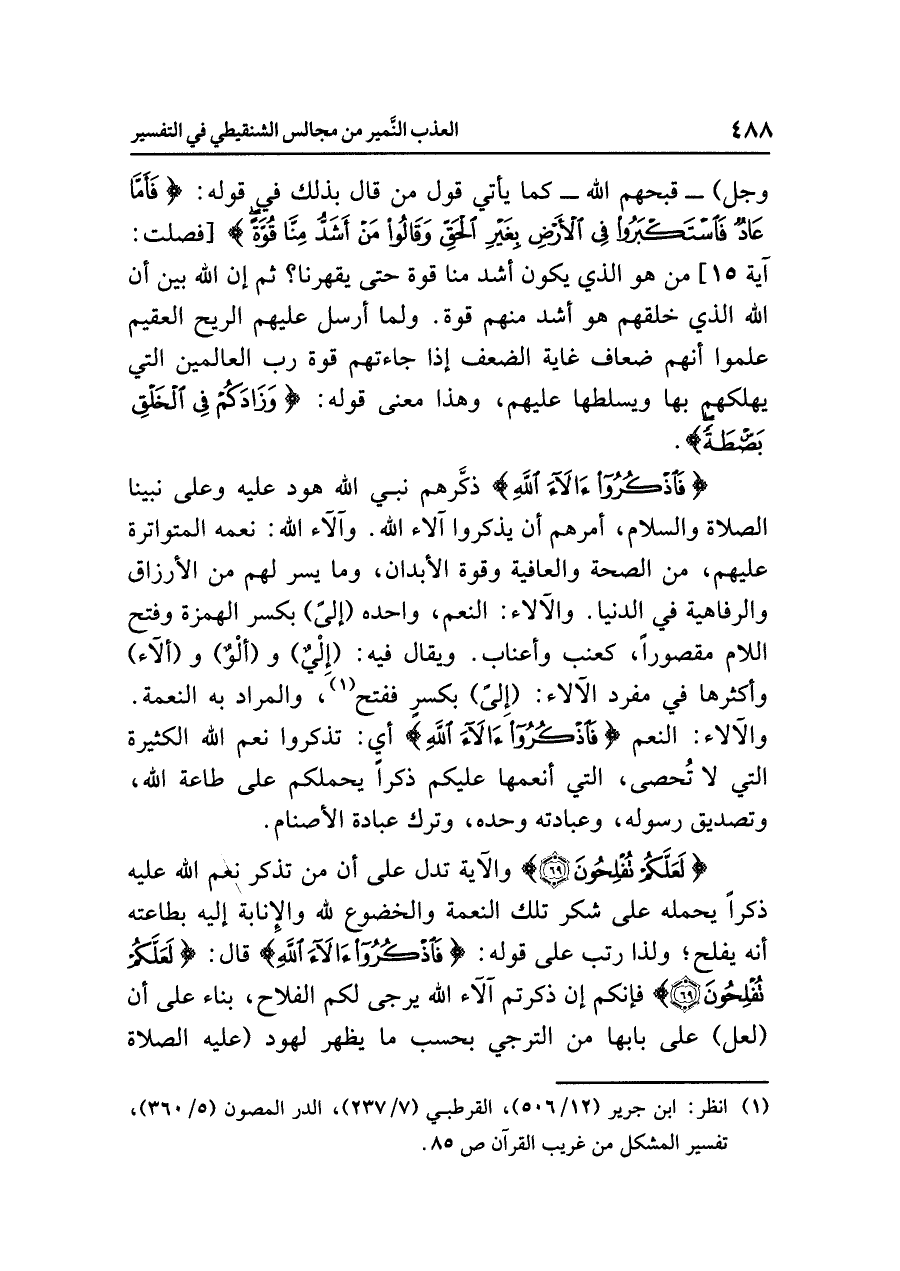 {فَاذْكُرُوا آلَاءَ اللَّهِ} ذكَّرهم نبيُّ اللهِ هودٌ عليه وعلى نبينا الصلاةُ والسلامُ، أمرهم أن يذكروا آلاءَ اللهِ. وآلَاءُ اللهِ: نِعَمُهُ المتواترةُ عليهم، من الصحةِ والعافيةِ وقوةِ الأبدانِ، وما يَسَّرَ لهم من الأرزاقِ والرفاهيةِ في الدنيا. والآلاءُ: النِّعَمُ، واحدُه (إِلى) بكسرِ الهمزةِ وفتحِ اللامِ مقصورًا، كَعِنَبٍ وَأَعْنَابٍ. ويقال فيه: (إِلْيٌ) و (ألْوٌ) و (ألآء) وأكثرُها في مفردِ الآلاءِ: (إِلىَ) بكسرٍ فَفَتْحٍ (¬١)، والمرادُ به النعمةُ. والآلاءُ: النِّعَمُ {فَاذْكُرُوا آلَاءَ اللَّهِ} أي: تَذَكَّرُوا نِعَمَ اللهِ الكثيرةَ التي لا تُحْصَى، التي أَنْعَمَهَا عليكم ذِكْرًا يحملكم على طاعةِ اللهِ، وتصديقِ رسولِه، وعبادتِه وحدَه، وتركِ عبادةِ الأصنامِ.