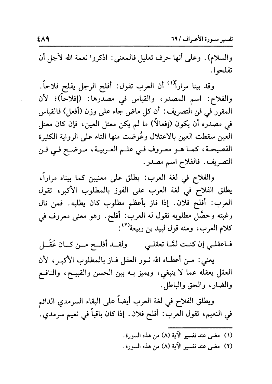 والفلاحُ في لغةِ العربِ: يُطْلَقُ على مَعْنَيَيْنِ كما بَيَّنَّاهُ مرارًا، يطلقُ الفلاحُ في لغةِ العربِ على الفوزِ بالمطلوبِ الأكبرِ، تقولُ العربُ: أَفْلَحَ فلانٌ. إذا فَازَ بأعظمِ مطلوبٍ كان يطلبُه. فَمَنْ نالَ رغبتَه وحصَّل مطلوبَه تقولُ له العربُ: أَفْلَحَ. وهو معنًى معروفٌ في كلامِ العربِ، ومنه قولُ لبيدِ بنِ ربيعةَ (¬٢):
