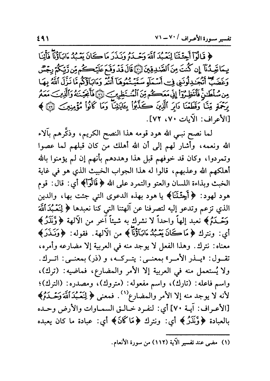 لَمَّا نصحَ نَبِيُّ اللَّهِ هودٌ قومَه هذا النصحَ الكريمَ، وذكَّرهم بآلاءِ اللهِ وَنِعَمَهُ، وأشارَ لهم إلى أن اللهَ أَهْلَكَ مَنْ كان قبلَهم لَمَّا عَصَوْا وتمردوا، وكان قد خَوَّفَهُمْ قبلَ هذا وهددهم بأنهم إن لم يؤمنوا باللهِ أَهْلَكَهُمُ اللهُ وَعَذَّبَهُمْ، قالوا له هذا الجوابَ الخبيثَ الذي هو في غايةِ الخبثِ وبذاءةِ اللسانِ والعتوِّ والتمردِ على اللهِ {قَالُوا} أي: قال: قومُ هودٍ لهودٍ: {أَجِئْتَنَا} يا هودُ بهذه الدعوى التي جئتَ بها، وَالدِّينِ الذي تَزْعُمُ وتدعو إليه لِتَصْرِفَنَا عن آلهتِنا التي كنا نعبدها: {لِنَعْبُدَ اللَّهَ وَحْدَهُ} نعبد إِلَهًا واحدًا لا نشرك به شيئًا آخَرَ من الآلهةِ {وَنَذَرَ} أي: ونتركَ {مَا كَانَ يَعْبُدُ آبَاؤُنَا} من الآلهةِ. فقولُه: {وَنَذَرَ} معناه: نتركَ. وهذا الفعلُ لا يوجدُ منه في العربيةِ إلا مضارعُه وَأَمْرُهُ، تقول: «يَذَرُ الأمرَ» بمعنَى: يتركه، و (ذَرْ) بمعنى: اتْرُكْ. ولا يُستعمل منه في العربيةِ إلا الأمرُ والمضارعُ، فماضيه: (تَرَكَ)، واسمُ فاعلِه: (تارك)، واسمُ مفعولِه: (متروكٌ)، ومصدرُه: (التركُ)؛ لأنه لَا يوجدُ منه إلا الأمرُ والمضارعُ (¬١). فمعنَى {لِنَعْبُدَ اللَّهَ وَحْدَهُ} [الأعراف: آية ٧٠] أي: لِنُفْرِدَ خالقَ السماواتِ والأرضِ وحدَه بالعبادةِ: {وَنَذَرَ} أي: ونتركَ {مَا كَانَ} أي: عبادةَ ما كان يعبدُه