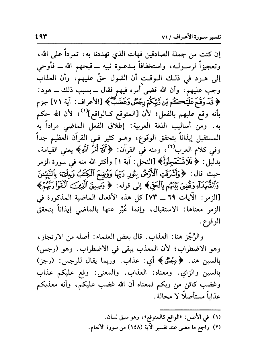 والرِّجْزُ هنا: العذابُ. قال بعضُ العلماءِ: أصلُه من الارتجازِ، وهو الاضطرابُ؛ لأن الْمُعَذَّبَ يبقى في الاضطرابِ. وهو (رجسٌ) بالسينِ هنا. {رِجْسٌ} أي: عذابٌ. وربما يقالُ للرجسِ: (رجزٌ) بالسينِ والزايِ. ومعناه: العذابُ. والمعنَى: وَقَعَ عليكم عذابٌ وغضبٌ كائنٌ من ربِّكم فمعناه أن اللَّهَ غَضِبَ عليكم، وأنه مُعَذِّبُكُمْ عذابًا مستأصلاً لا مَحَالَةَ.