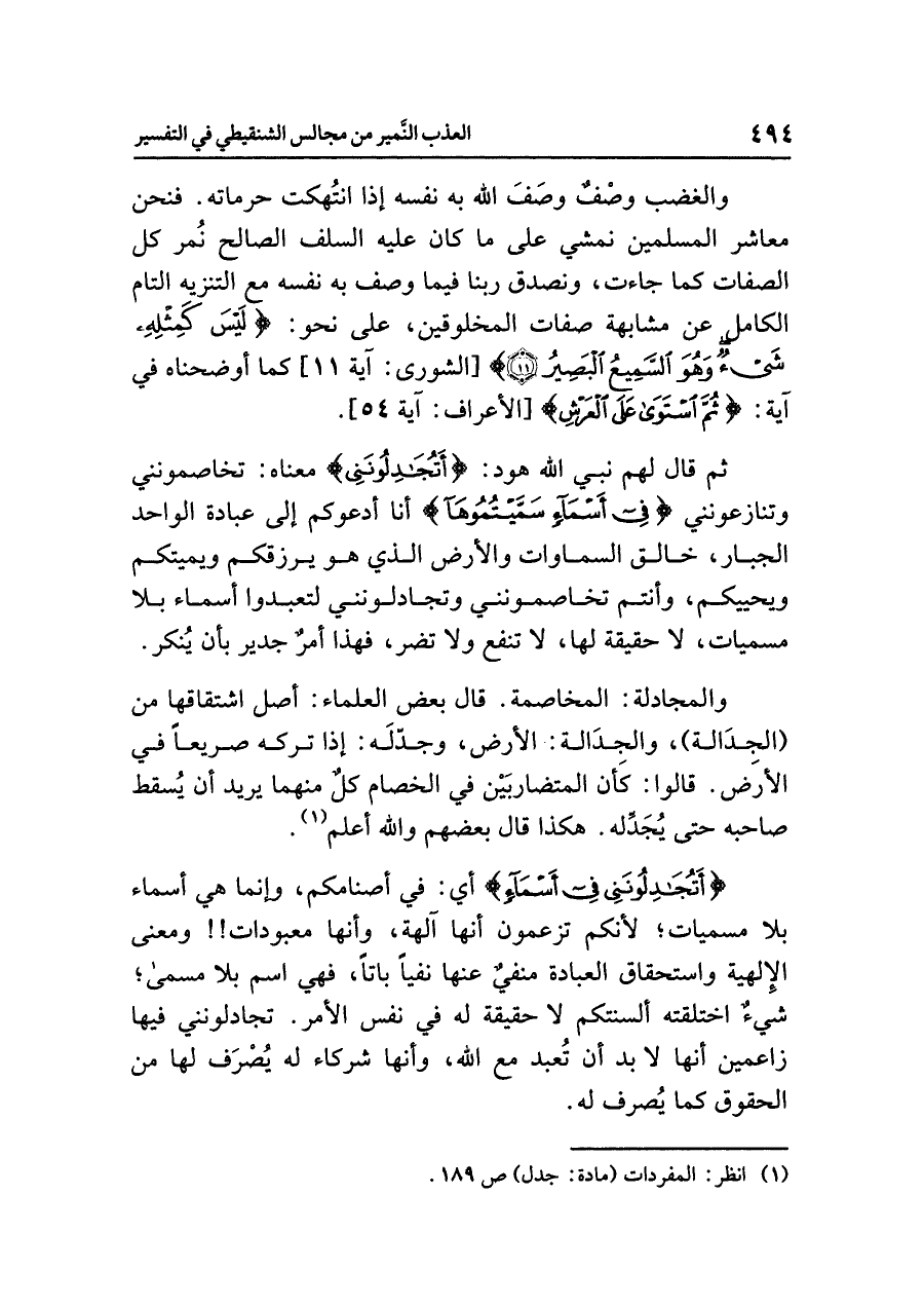 ثم قال لهم نَبِيُّ اللهِ هودٌ: {أَتُجَادِلُونَنِي} معناه: تُخَاصِمُونَنِي وَتُنَازِعُونَنِي: {فِي أَسْمَاءٍ سَمَّيْتُمُوهَا} أنا أدعوكم إلى عبادةِ الواحدِ الجبارِ، خالقِ السماواتِ والأرضِ الذي هو يرزقُكم وَيُمِيتُكم ويحييكم، وأنتم تخاصمونَني وتجادلونَني لتعبدوا أسماءً بلا مسمياتٍ، لا حقيقةَ لها، لا تنفعُ ولا تضرُّ، فهذا أمرٌ جديرٌ بأن يُنْكَرَ.