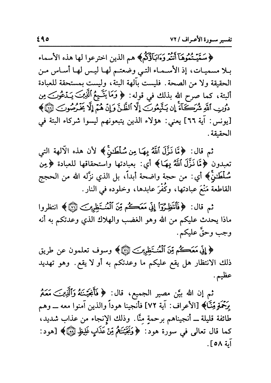 ثم قال: {مَّا نَزَّلَ اللَّهُ بِهَا مِنْ سُلْطَانٍ} لأن هذه الآلهةَ التي تعبدونَ {مَّا نَزَّلَ اللَّهُ بِهَا} أي: بعبادتِها واستحقاقِها للعبادةِ {مِنْ سُلْطَانٍ} أي: من حُجَّةٍ واضحةٍ أبدًا، بل الذي نزَّله اللهُ من الحججِ القاطعةِ مَنْعَ عبادتِها، وكُفْرَ عابدِها، وخلودِه في النارِ.