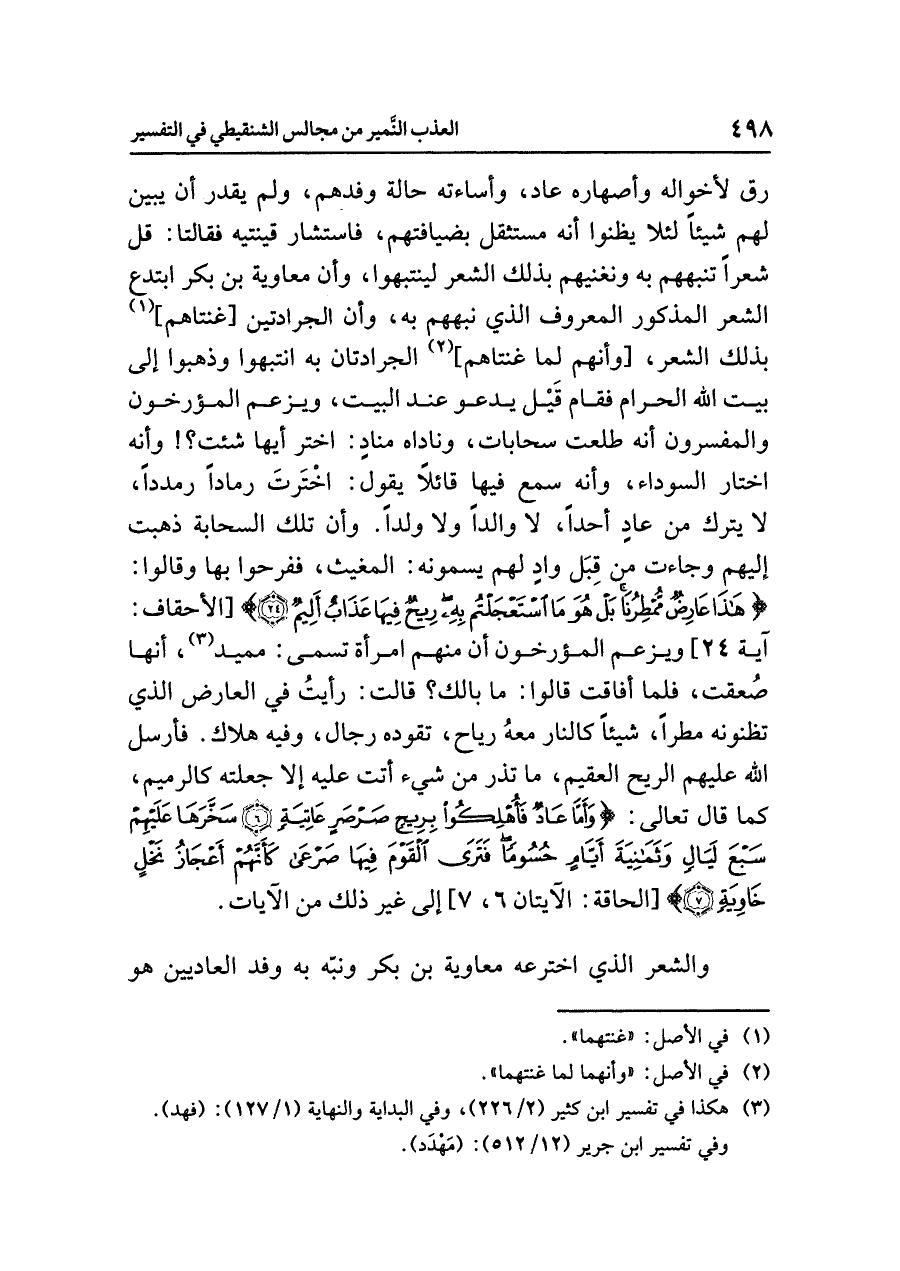 رَقَّ لأخوالِه وأصهارِه عادٍ، وَأَسَاءَتْهُ حالةُ وَفْدِهِمْ، ولم يَقْدِرْ أن يُبَيِّنَ لهم شيئًا لئلا يظنوا أنه مُسْتَثْقِلٌ بضيافتِهم، فاستشارَ قينتيه فَقَالَتَا: قُلْ شعرًا تنبههم به ونغنيهم بذلك الشعرِ لينتبهوا، وأن معاويةَ بنَ بكرٍ ابتدعَ الشعرَ المذكورَ المعروفَ الذي نَبَّهُهُمْ به، وأن الجرادتين [غنتاهم] (¬١) بذلك الشعرِ، [وأنهم لما غنتاهم] (¬٢) الجرادتان به انتبهوا وذهبوا إلى بيتِ اللهِ الحرامِ فقام قَيْل يدعو عندَ البيتِ، ويزعمُ المؤرخونَ والمفسرونَ أنه طَلَعَتْ سَحَابَاتٌ، وناداه منادٍ: اخْتَرْ أيها شِئْتَ؟! وأنه اخْتَلَى السوداءَ، وأنه سَمِعَ فيها قائلاً يقولُ: اخْتَرتَ رمادًا رمددًا، لا يترك من عادٍ أحدًا، لا والدًا ولا ولدًا. وأن تلك السحابةَ ذَهَبَتْ إليهم وجاءت مِنْ قِبَلِ وادٍ لهم يسمونَه: المغيثَ، ففرحوا بها وقالوا: {هَذَا عَارِضٌ مُّمْطِرُنَا} [الأحقاف: آية ٢٤] ويزعمُ المؤرخونَ أن منهم امرأةً تُسَمَّى: مميد (¬٣)، أنها صُعِقَتْ، فلما أَفَاقَتْ قالوا: ما بَالُكِ؟ قالت: رأيتُ في العارضِ الذي تظنونه مطرًا شيئًا كالنارِ مَعَهُ رياحٌ، تَقُودُهُ رجالٌ، وفيه هلاكٌ. فأرسل اللهُ عليهم الريحَ العقيمَ، ما تذرُ من شيءٍ أَتَتْ عليه إلا جَعَلَتْهُ كالرميمِ، كما قال تعالى: {وَأَمَّا عَادٌ فَأُهْلِكُوا بِرِيحٍ صَرْصَرٍ عَاتِيَةٍ (٦) سَخَّرَهَا عَلَيْهِمْ سَبْعَ لَيَالٍ وَثَمَانِيَةَ أَيَّامٍ حُسُومًا فَتَرَى الْقَوْمَ فِيهَا صَرْعَى كَأَنَّهُمْ أَعْجَازُ نَخْلٍ خَاوِيَةٍ (٧)} [الحاقة: الآيتان ٦، ٧] إلى غيرِ ذلك من الآياتِ.
