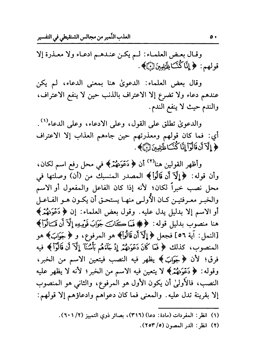 وأظهر القولين هنا (¬٢) أن {دَعْوَاهُمْ} في محل رفع اسم لكان، وأن قوله: {إِلَاّ أَن قَالُواْ} المصدر المنسبك من (أن) وصلتها في محل نصب خبراً لكان؛ لأنه إذا كان الفاعل والمفعول أو الاسم والخبر معرفتين كان الأُولى منها يستحق أن يكون هو الفاعل أو الاسم إلا بدليل يدل عليه. وقول بعض العلماء: إن {دَعْوَاهُمْ} هنا منصوب بدليل قوله: {فَمَا كَانَ جَوَابَ قَوْمِهِ إِلَاّ أَن قَالُوا} [النمل: آية ٥٦] فجعل {إِلَاّ أَن قَالُوا} هو المرفوع، و {جَوَابَ} هو المنصوب، كذلك {فَمَا كَانَ دَعْوَاهُمْ إِذْ جَاءهُمْ بَأْسُنَا إِلَاّ أَن قَالُواْ} فيه فرق؛ لأن {جَوَابَ} يظهر فيه النصب فيتعين الاسم من الخبر، وقوله: {دَعْوَاهُمْ} لا يتعين فيه الاسم من الخبر؛ لأنه لا يظهر عليه النصب، فالأَولى أن يكون الأول هو المرفوع، والثاني هو المنصوب إلا بقرينة تدل عليه. والمعنى فما كان دعواهم وادعاؤهم إلا قولهم: