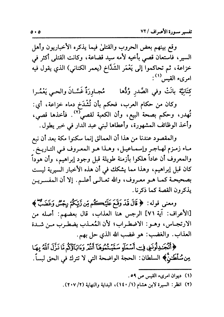 والمقصودُ عندنا من هذا أن العمالقَ إنما سَكَنُوا مكةَ بعدَ أن نبعَ ماءُ زمزمَ لهاجرَ وإسماعيلَ، وهذا هو المعروفُ في التاريخِ. والمعروفُ أن عادًا هلكوا بأزمنةٍ طويلةٍ قبلَ وجودِ إبراهيمَ، وأن هودًا كان قبل إبراهيمَ، وهذا مما يُشَكِّكُ في أن هذه الأخبارَ السيريةَ ليست بصحيحةٍ كما هو معروفٌ، وَاللَّهُ تعالى أعلمُ. إلا أن المفسرينَ يذكرونَ القصةَ كما ذَكَرْنَا.