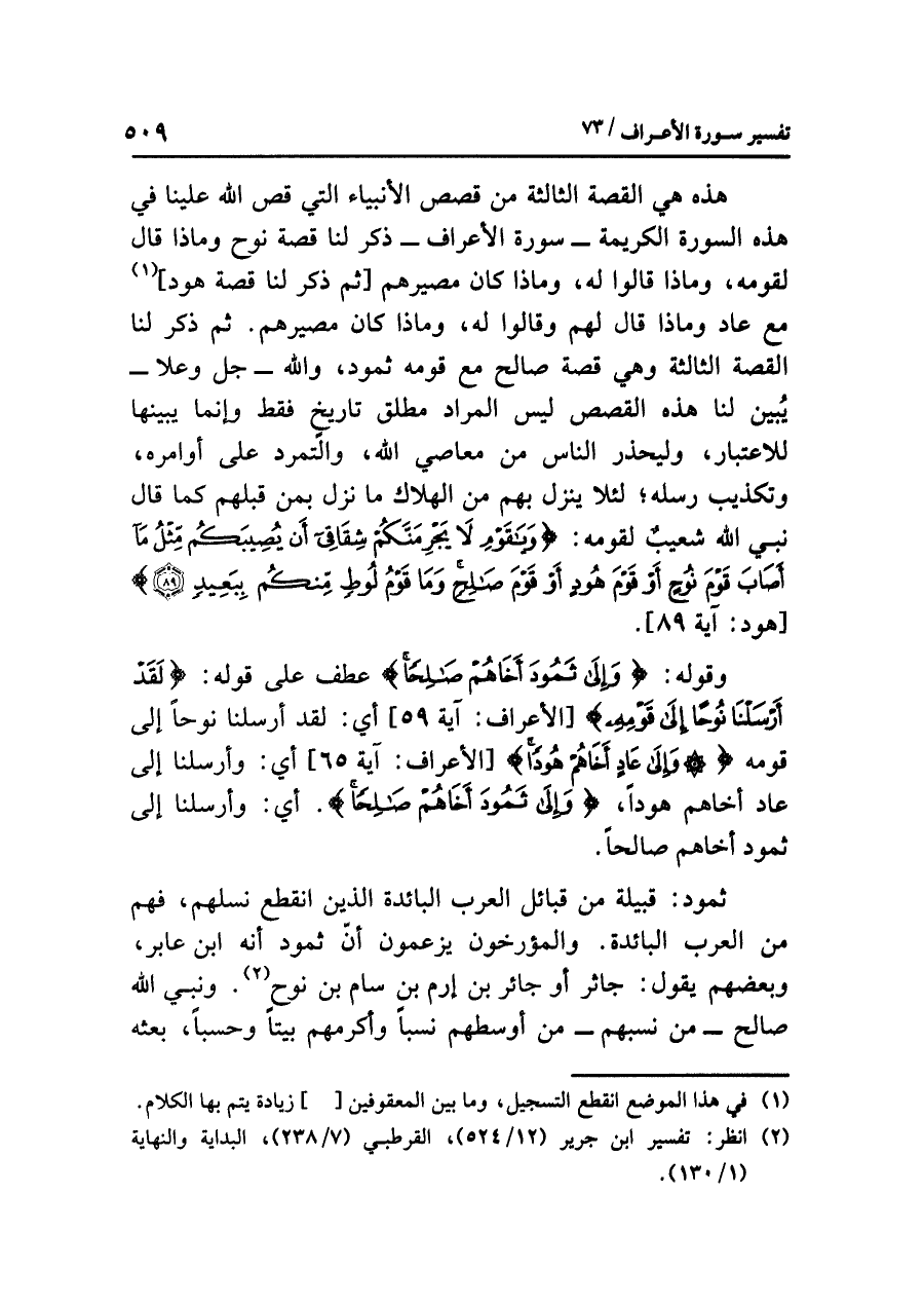 هذه هي القصةُ الثالثةُ من قصصِ الأنبياءِ التي قَصَّ اللَّهُ علينا في هذه السورةِ الكريمةِ ... - سورةِ الأعرافِ - ذَكَرَ لنا قصةَ نوحٍ وماذا قال لقومه، وماذا قالوا له، وماذا كان مصيرُهم [ثم ذَكَرَ لنا قصةَ هودٍ] (¬١) مع عادٍ وماذا قال لهم وقالوا له، وماذا كان مصيرُهم. ثم ذَكَرَ لنا القصةَ الثالثةَ وهي قصةُ صالحٍ مع قومِه ثمود، واللهُ - جل وعلا - يُبَيِّنُ لنا هذه القصصَ ليس المرادُ مطلقَ تاريخٍ فقط، وإنما يُبَيِّنُهَا للاعتبارِ، وليحذر الناس من معاصي الله، والتمردِ على أوامرِه، وتكذيبِ رُسُلِهِ؛ لئلَاّ ينزلَ بهم من الهلاكِ ما نَزَلَ بِمَنْ قَبْلَهُمْ كما قال نبي اللَّهِ شعيبٌ لقومِه: {وَيَا قَوْمِ لَا يَجْرِمَنَّكُمْ شِقَاقِي أَنْ يُصِيبَكُم مِّثْلُ مَا أَصَابَ قَوْمَ نُوحٍ أَوْ قَوْمَ هُودٍ أَوْ قَوْمَ صَالِحٍ وَمَا قَوْمُ لُوطٍ مِّنْكُمْ بِبَعِيدٍ (٨٩)} [هود: آية ٨٩].