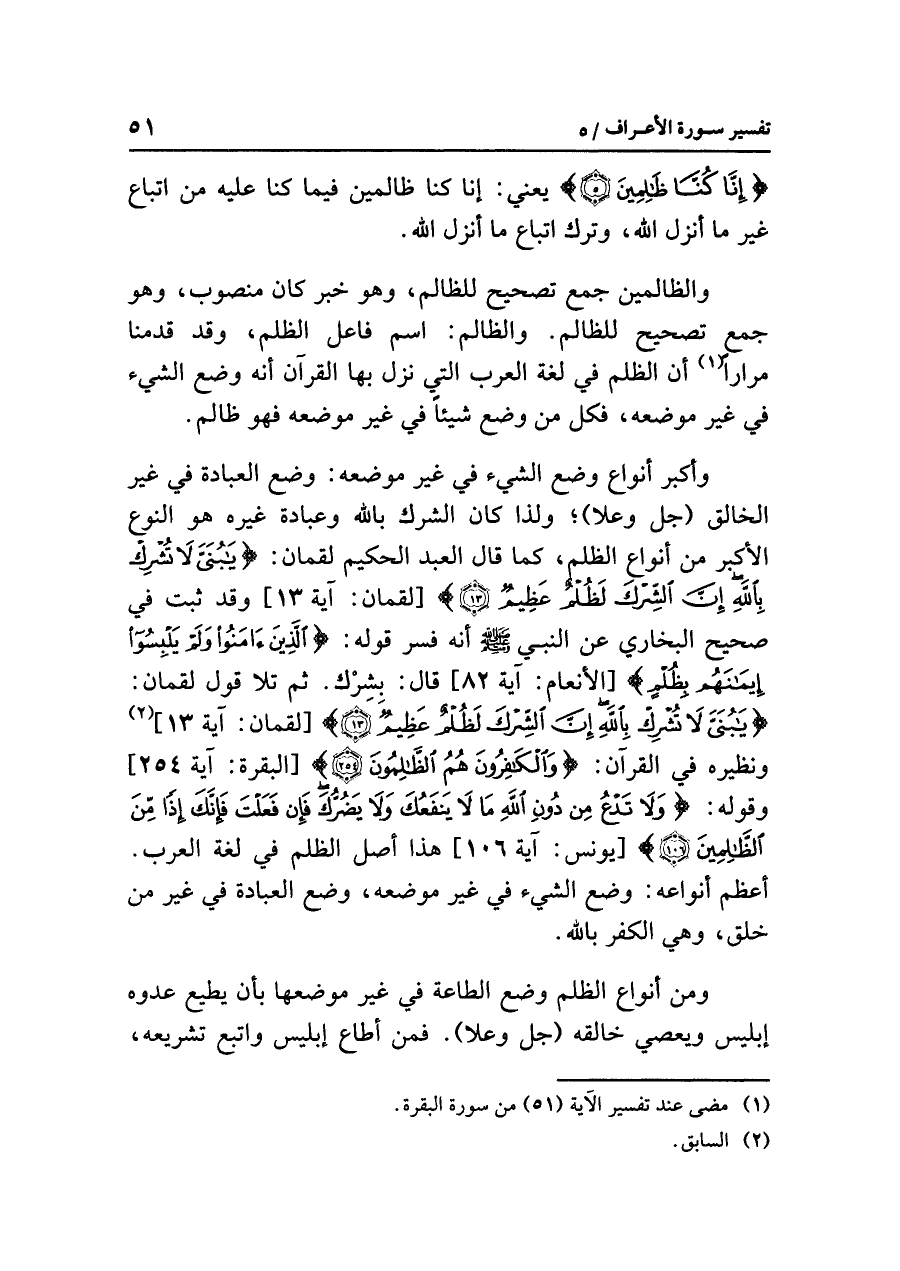 وأكبر أنواع وضع الشيء في غير موضعه: وضع العبادة في غير الخالق (جل وعلا)؛ ولذا كان الشرك بالله وعبادة غيره هو النوع الأكبر من أنواع الظلم، كما قال العبد الحكيم لقمان: {يَا بُنَيَّ لَا تُشْرِكْ بِالله إِنَّ الشِّرْكَ لَظُلْمٌ عَظِيمٌ (١٣)} [لقمان: آية ١٣] وقد ثبت في صحيح البخاري عن النبي صلى الله عليه وسلم أنه فسر قوله: {الَّذِينَ آمَنُواْ وَلَمْ يَلْبِسُواْ إِيمَانَهُم بِظُلْمٍ} [الأنعام: آية ٨٢] قال: بِشِرْك. ثم تلا قول لقمان: {يَا بُنَيَّ لَا تُشْرِكْ بِالله إِنَّ الشِّرْكَ لَظُلْمٌ عَظِيمٌ} [لقمان: آية ١٣] (¬٢) ونظيره في القرآن: {وَالْكَافِرُونَ هُمُ الظَّالِمُونَ} [البقرة: آية ٢٥٤] وقوله: {وَلَا تَدْعُ مِن دُونِ الله مَا لَا يَنفَعُكَ وَلَا يَضُرُّكَ فَإِن فَعَلْتَ فَإِنَّكَ إِذاً مِّنَ الظَّالِمِينَ (١٠٦)} [يونس: آية ١٠٦] هذا أصل الظلم في لغة العرب. أعظم أنواعه: وضع الشيء في غير موضعه، وضع العبادة في غير مَنْ خلق، وهي الكفر بالله.