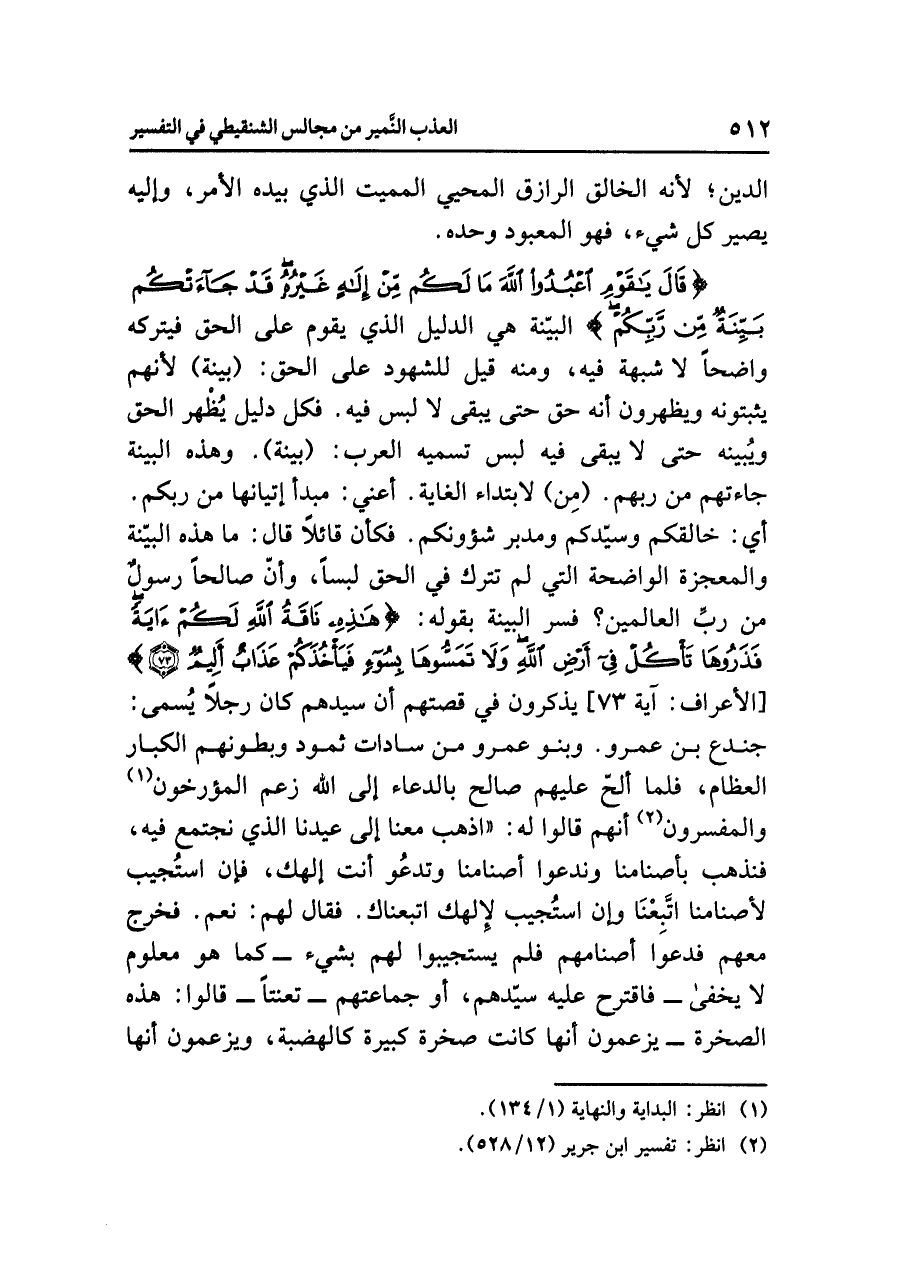 {قَالَ يَا قَوْمِ اعْبُدُوا اللَّهَ مَا لَكُم مِّنْ إِلَهٍ غَيْرُهُ قَدْ جَاءتْكُم بَيِّنَةٌ مِّن رَّبِّكُمْ} الْبَيِّنَةُ: هي الدليلُ الذي يقومُ على الحقِّ فيتركُه واضحًا لا شبهةَ فيه، ومنه قِيلَ للشهودِ على الحقِّ: (بينة) لأنهم يُثْبِتُونَهُ ويظهرون أنه حَقٌّ حتى يبقَى لَا لَبْسَ فيه. فَكُلُّ دليلٍ يُظْهِرُ الحقَّ وَيُبَيِّنُهُ حتى لا يبقى فيه لبسٌ تُسَمِّيهِ العربُ: (بَيِّنَةً). وهذه البينةُ جاءتهم من رَبِّهِمْ. (مِن) لابتداءِ الغايةِ. أعنِي: مبدأُ إتيانِها من ربكم. أي: خالقِكم وسيِّدكم ومدبرِ شؤونكم. فكأن قائلاً قال: ما هذه الْبَيِّنَةُ والمعجزةُ الواضحةُ التي لم تَتْرُكْ في الحقِّ لَبْسًا، وَأَنَّ صالحًا رسولٌ من ربِّ العالمين؟ فَسَّرَ البينةَ بقولِه: {هَذِهِ نَاقَةُ اللَّهِ لَكُمْ آيَةً فَذَرُوهَا تَأْكُلْ فِي أَرْضِ اللَّهِ وَلَا تَمَسُّوهَا بِسُوَءٍ فَيَأْخُذَكُمْ عَذَابٌ أَلِيمٌ} [الأعراف: آية ٧٣] يذكرونَ في قصتِهم أن سيدَهم كان رجلاً يُسَمَّى: جندعَ بنَ عمرٍو. وَبَنُو عمرٍو من ساداتِ ثمودَ وبطونِهم الكبارِ العظامِ، فلما أَلَحَّ عليهم صالحٌ في الدعاءِ إلى اللَّهِ زَعَمَ المؤرخونَ (¬١) والمفسرونَ (¬٢) أنهم قالوا له: «اذْهَبْ مَعَنَا إلى عِيدِنَا الذي نجتمعُ فيه، فنذهبُ بأصنامِنا وندعو أصنامَنا وتدعُو أنتَ إِلَهَكَ، فإن اسْتُجِيبَ لأصنامِنا اتَّبِعْنَا وإن اسْتَجِيبَ لإِلَهِكَ اتَّبَعْنَاكَ. فقال لهم: نَعَمْ. فخرجَ معهم فَدَعَوْا أصنامَهم فلم يستجيبوا لهم بشيءٍ - كما هو معلومٌ لَا يَخْفَى- فاقترحَ عليه سَيِّدُهُمْ، أو جماعتُهم - تَعَنُّتًا - قالوا: هذه الصخرةُ - يزعمونَ أنها كانت صخرةً كبيرةً كالهضبةِ، ويزعمونَ أنها