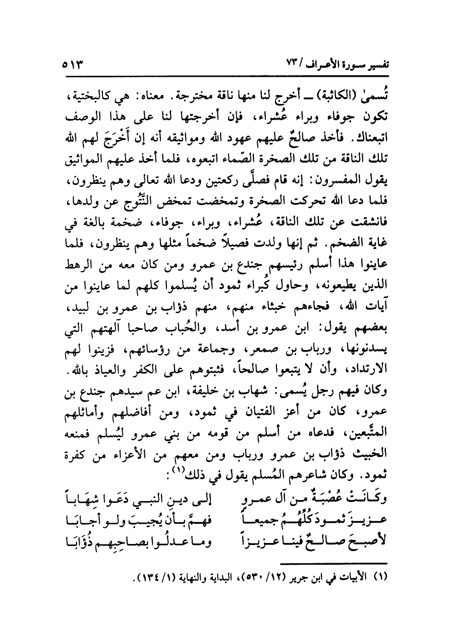 ثم إنها وَلَدَتْ فصيلاً ضخمًا مثلَها وهم ينظرونَ، فلما عَايَنُوا هذا أسلمَ رئيسُهم جندعُ بنُ عمرٍو وَمَنْ كان معه من الرهطِ الذين يُطِيعُونَهُ، وحاولَ كُبراءُ ثمودَ أن يُسلموا كلُّهم لَمَّا عَايَنُوا من آياتِ اللهِ، فجاءهم خبثاءُ منهم، منهم ذؤابُ بنُ عمرِو بنِ لَبِيدٍ، بعضُهم يقولُ: ابنُ عمرِو بنُ أَسَدٍ، والحُبابُ صَاحِبَا آلهتهم التي يَسْدنُونَهَا، وربابُ بنُ صمعر، وجماعةٌ من رؤسائِهم، فَزَيَّنُوا لهم الارتدادَ، وأن لا يتبعوا صَالِحًا، فَثَبَّتُوهُمْ على الكفرِ والعياذُ بالله. وكان فيهم رجلٌ يُسَمَّى: شهابَ بنَ خليفةَ، ابن عَمِّ سيدِهم جندعَ بنِ عمرٍو، كان من أَعَزِّ الفتيانِ في ثمودَ، ومن أفاضلِهم وأماثلِهم المتَّبعين، فدعاه مَنْ أَسْلَمَ مِنْ قومِه من بني عمرو ليُسلم فمنعه الخبيثُ ذؤابُ بنُ عمرٍو وربابٌ وَمَنْ معهم من الأعزاءِ من كفرةِ ثمودَ. وكان شاعرُهم المُسلم يقولُ في ذلك (¬١):