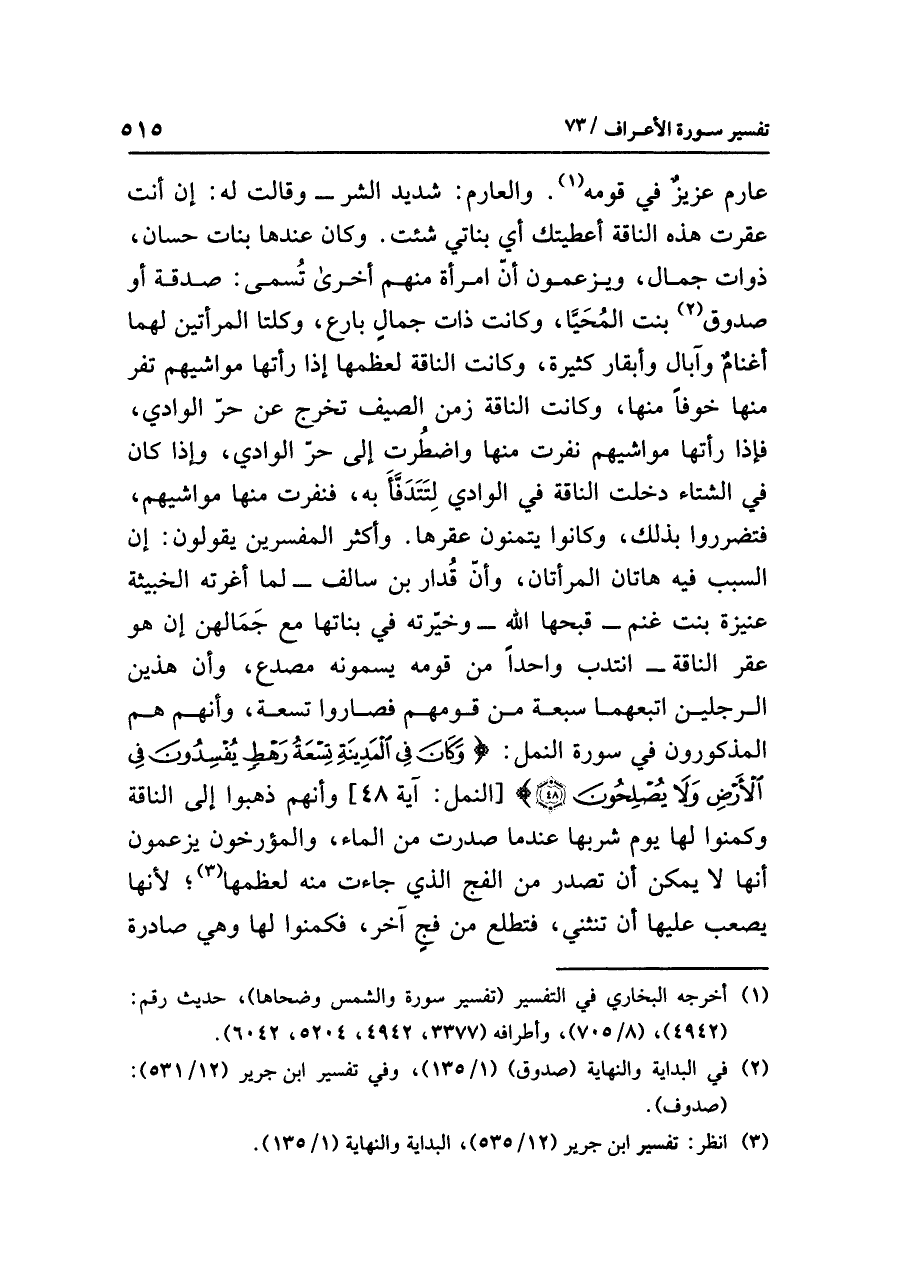والعارمُ: شديدُ الشرِّ - وقالت له: إن أنتَ عقرتَ هذه الناقةَ أعطيتُك أَيَّ بَنَاتِي شِئْتَ. وكان عندها بناتٌ حِسَانٌ، ذواتُ جمالٍ، ويزعمونَ أن امرأةً منهم أخرى تُسَمَّى: صدقةَ أو صدوقَ (¬٢) بنتَ الْمُحَيَّا، وكانت ذاتَ جمالٍ بارعٍ، وَكِلْتَا المرأتين لهما أغنامٌ وآبال وأبقارٌ كثيرةٌ، وكانت الناقةُ لِعِظَمِهَا إذا رأتها مواشيهم تَفِرُّ منها خوفًا منها، وكانت الناقةُ زمنَ الصيفِ تخرجُ عن حرِّ الوادي، فإذا رَأَتْهَا مواشيهم نَفَرَتْ منها واضطُرت إلى حرِّ الوادي، وإذا كان في الشتاءِ دَخَلَتِ الناقةُ في الوادي لِتَتَدَفَّأَ به، فنفرت منها مواشيهم، فتضرروا بذلك، وكانوا يتمنونَ عَقْرَهَا. وأكثرُ المفسرين يقولونَ: إن السببَ فيه هاتانِ المرأتانِ، وأنَّ قُدارَ بنَ سالفٍ - لَمَّا أَغْرَتْهُ الخبيثةُ عنيزةُ بنتُ غنمٍ - قَبَّحَهَا اللَّهُ - وَخَيَّرَتْهُ في بناتِها مع جَمَالِهِنَّ إن هو عَقَرَ الناقةَ - انتدبَ واحدًا من قومِه يُسَمُّونَهُ مصدعَ، وأن هذين الرَّجُلَيْنِ اتَّبَعَهُمَا سبعةٌ من قومِهم فصاروا تسعةً، وأنهم هم المذكورونَ في سورةِ النملِ: {وَكَانَ فِي المَدِينَةِ تِسْعَةُ رَهْطٍ يُفْسِدُونَ فِي الأَرْضِ وَلَا يُصْلِحُونَ (٤٨)} [النمل: أية ٤٨] وأنهم ذهبوا إلى الناقةِ وَكَمِنُوا لها يومَ شُرْبِهَا عندما صَدَرَتْ من الماءِ، والمؤرخونَ يزعمونَ أنها لا يمكنُ أن تصدر من الفجِّ الذي جاءت منه لِعِظَمِهَا (¬٣)؛ لأنها يصعب عليها أن تَنْثَنِيَ، فتطلع من فَجٍّ آخَرَ، فكمنوا لها وهي صادرةٌ