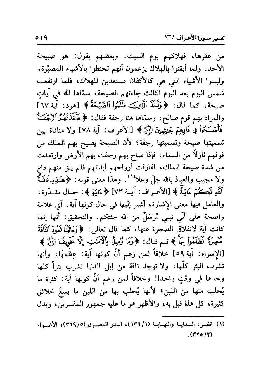 وهذا معنَى قولِه: {هَذِهِ نَاقَةُ اللَّهِ لَكُمْ آيَةً} [الأعراف: آية ٧٣] {آيَةً}: حالٌ مقدَّرةٌ، والعاملُ فيها معنَى الإشارةِ، أُشِيرَ إليها في حالِ كونِها آيةً. أي علامةً واضحةً على أنِّي نَبِيٌّ مُرْسَلٌ من اللَّهِ جِئْتُكُمْ. والتحقيقُ: أنها إنما كانت آيةً لانْفِلَاقِ الصخرةِ عنها، كما قال تعالى: {وَآتَيْنَا ثَمُودَ النَّاقَةَ مُبْصِرَةً} ثم قال: {وَمَا نُرْسِلُ بِالآيَاتِ إِلَاّ تَخْوِيفًا} [الإسراء: آية ٥٩] خِلَافًا لمن زَعَمَ أن كونَها آيةً: عِظَمُهَا، وأنها تشربُ البئرَ كُلَّهَا، ولا توجدُ ناقةٌ من إبلِ الدنيا تشربُ بِئْرًا كُلَّهَا وحدَها في وقتٍ واحدٍ!! وخلافًا لِمَنْ زعم أن كونَها آيةً: كثرةُ ما يُحْلَبُ منها من اللبنِ؛ لأنها يُحْلَبُ بها من اللبنِ ما يَسَعُ خلائقَ كثيرةً، كل هذا قيل به، والأظهرُ هو ما عليه جمهورُ المفسرينَ، ويدلُّ