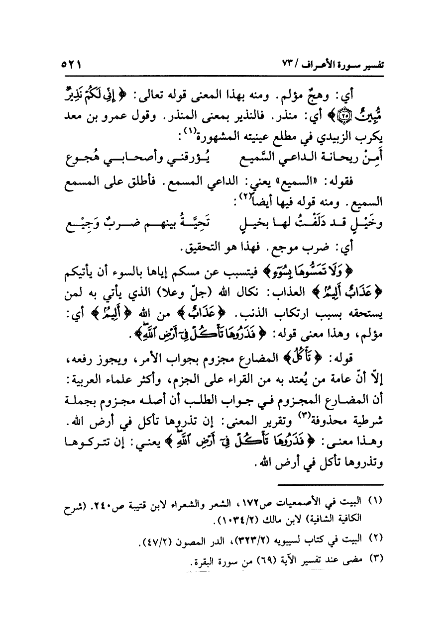 قولُه: {تَأْكُلْ} المضارعُ مجزومٌ بجوابِ الأمرِ، ويجوزُ رَفْعُهُ، إلا أنَّ عَامَّةَ مَنْ يُعْتَدُّ به من القراءِ على الجزمِ، وأكثرُ علماءِ العربيةِ: أن المضارعَ المجزومَ في جوابِ الطلبِ أن أصلَه مجزومٌ بجملةٍ شرطيةٍ محذوفةٍ (¬٣) وتقريرُ المعنَى: إن تَذَرُوهَا تَأْكُلْ في أرضِ اللهِ. وهذا معنَى: {فَذَرُوهَا تَأْكُلْ فِي أَرْضِ اللَّهِ} يعنِي: إن تَتْرُكُوهَا وتذروها تأكلْ في أرضِ اللهِ.