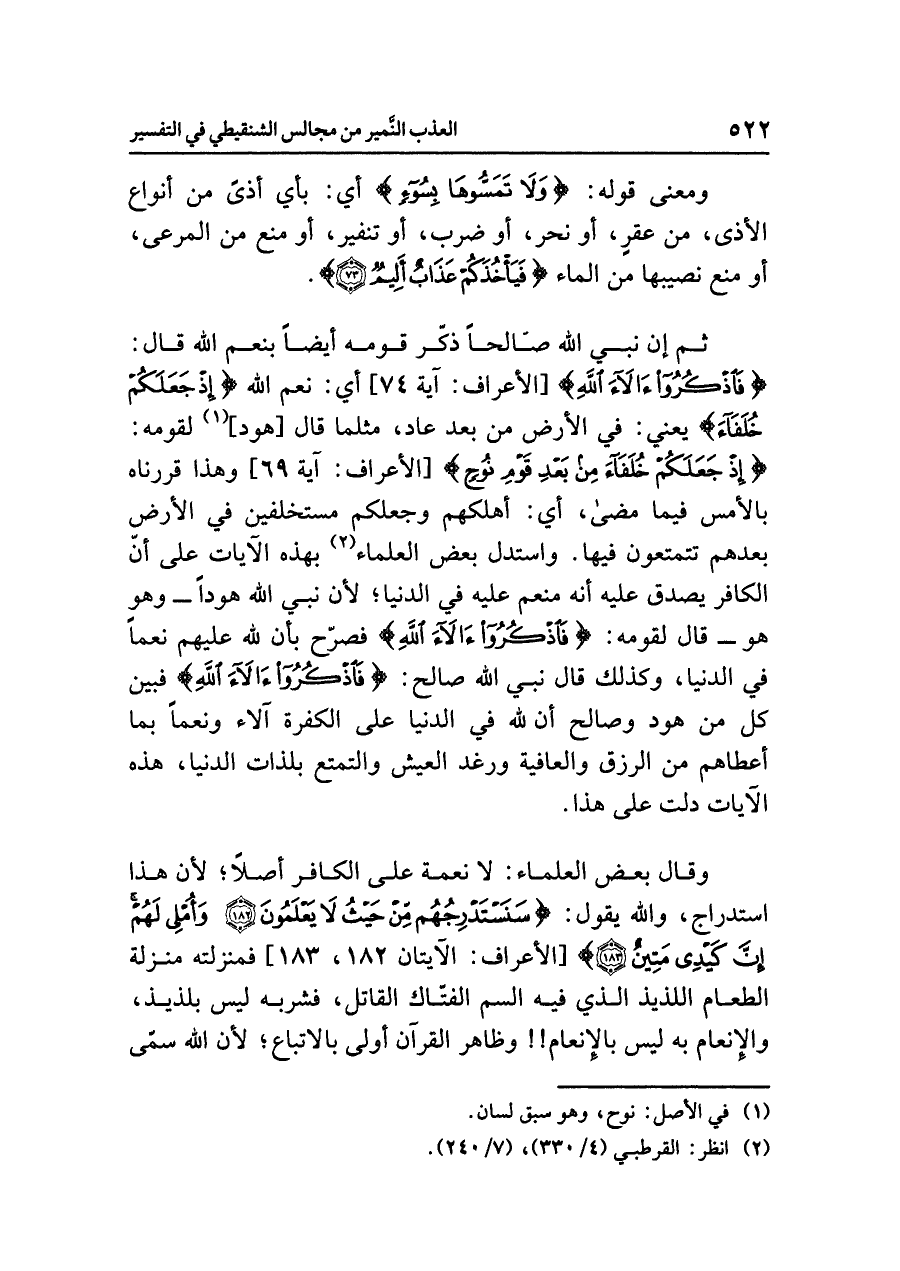 ثم إن نَبِيَّ اللهِ صالحًا ذكَّر قومَه أيضًا بِنِعَمِ اللهِ قال: {فَاذْكُرُوا آلَاءَ اللَّهِ} [الأعراف: آية ٧٤] أي: نِعَمَ اللهِ {إِذْ جَعَلَكُمْ خُلَفَاءَ} يعني: في الأرضِ من بعد عَادٍ، مثلما قال [هود] (¬١) لقومِه: {إِذْ جَعَلَكُمْ خُلَفَاءَ مِنْ بَعْدِ قَوْمِ نُوحٍ} [الأعراف: آية ٦٩] وهذا قَرَّرْنَاهُ فيما مَضَى، أي: أَهْلَكَهُمْ وجعلكم مُسْتَخْلَفِينَ في الأرضِ بعدَهم تتمتعونَ فيها. واستدلَّ بعضُ العلماء (¬٢) بهذه الآياتِ على أن الكافرَ يصدقُ عليه أنه مُنَعَّمٌ عليه في الدنيا؛ لأن نَبِيَّ اللهِ هودًا - وهو هو - قال لقومِه: {فَاذْكُرُوا آلَاءَ اللَّهِ} فصرَّح بأن لله عليهم نِعَمًا في الدنيا، وكذلك قال نَبِيُّ اللهِ صالحٌ: {فَاذْكُرُوا آلَاءَ اللَّهِ} فَبَيَّنَ كُلٌّ مِنْ هودٍ وصالحٍ أن لله في الدنيا على الكفرةِ آلاء وَنِعَمًا بما أعطاهم من الرزقِ والعافيةِ ورغدِ العيشِ والتمتعِ بلذاتِ الدنيا، هذه الآياتُ دَلَّتْ على هذا.
