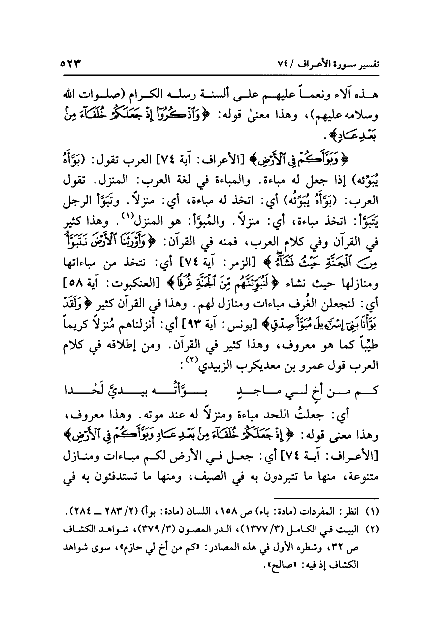 {وَبَوَّأَكُمْ فِي الأَرْضِ} [الأعراف: آية ٧٤] العربُ تقولُ: (بَوَّأَهُ يُبَوِّئه) إذا جَعَلَ له مباءة. والمباءةُ في لغةِ العربِ: المنزلُ. تقولُ العربُ: (بَوَّأَهُ يُبَوِّئُهُ) أي: اتَّخَذَ له مباءةً، أي: منزلاً. وتَبَوَّأَ الرجلُ يَتَبَوَّأ: اتخذَ مباءةً، أي: منزلاً. والمبوَّأ: هو المنزلُ (¬١). وهذا كثيرٌ في القرآنِ وفي كلامِ العربِ، فَمِنْهُ في القرآنِ: {وَأَوْرَثَنَا الأَرْضَ نَتَبَوَّأُ مِنَ الجَنَّةِ حَيْثُ نَشَاءُ} [الزمر: آية ٧٤] أي: نَتَّخِذُ من مباءاتها ومنازلِها حيث نشاءُ: {لَنُبَوِّئَنَّهُم مِّنَ الْجَنَّةِ غُرَفًا} [العنكبوت: آية ٥٨] أي: لَنَجْعَلَنَّ الغرفَ مباءاتٍ ومنازلَ لهم. وهذا في القرآنِ كثيرٌ {وَلَقَدْ بَوَّأنَا بَنِي إِسْرَائِيلَ مُبَوَّأَ صِدْقٍ} [يونس: آية ٩٣] أي: أَنْزَلْنَاهُمْ مُنْزَلاً كَرِيمًا طَيِّبًا كما هو معروفٌ، وهذا كثيرٌ في القرآنِ. ومن إطلاقِه في كلامِ العربِ قولُ عمرِو بنِ معدِ يكربَ الزبيديِّ (¬٢):