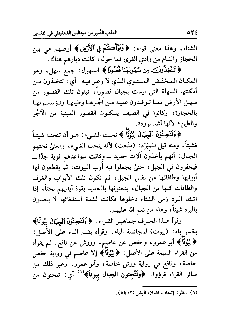 وقرأَ هذا الحرفَ جماهيرُ القراءِ: {وَتَنْحِتُونَ الجِبَالَ بُيُوتًا} بكسرِ باءِ: (بيوت) لِمُجَانَسَةِ الياءِ. وقرأه بضمِّ الباءِ على الأصلِ: {بُيُوتًا} أبو عمرٍو، وحفصٌ عن عاصمٍ، وورشٌ عن نافعٍ. لم يَقْرَأْهُ مِنَ القراءِ السبعةِ على الأصلِ: {بُيُوتًا} إلا عاصمٌ في روايةِ حفصٍ خاصةً، ونافعٌ في روايةِ ورشٍ خاصةً، وأبو عمرٍو. وغيرُ ذلك من سائرِ القراءِ قرؤوا: {وتَنْحِتونَ الجبال بِيوتًا} (¬١) أي: تنحتونَ من