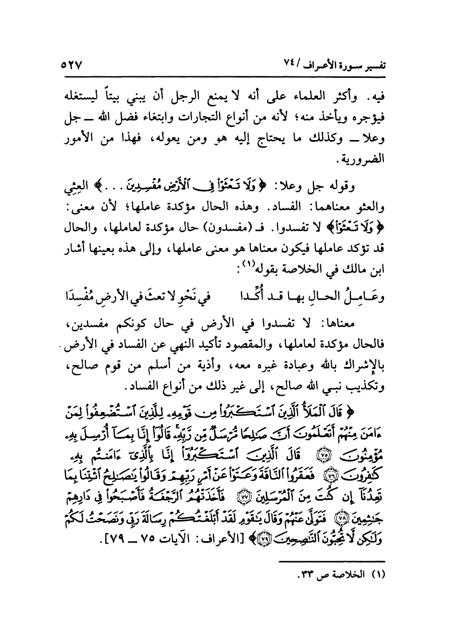 وقولُه جل وعلا: {وَلَا تَعْثَوْا فِي الأَرْضِ مُفْسِدِينَ ... } العِثِيُّ والعثوُّ معناهما: الفسادُ. وهذه الحالُ مؤكدةٌ عاملها؛ لأن معنَى: {وَلَا تَعْثَوْا} لا تُفْسِدُوا. فـ (مفسدون) حالٌ مؤكدةٌ لعامِلِها، والحالُ قد تؤكدُ عاملَها فيكونُ معناها هو معنَى عاملها، وإلى هذه بعينِها أشارَ ابنُ مالكٍ في الخلاصةِ بقوله (¬١):
