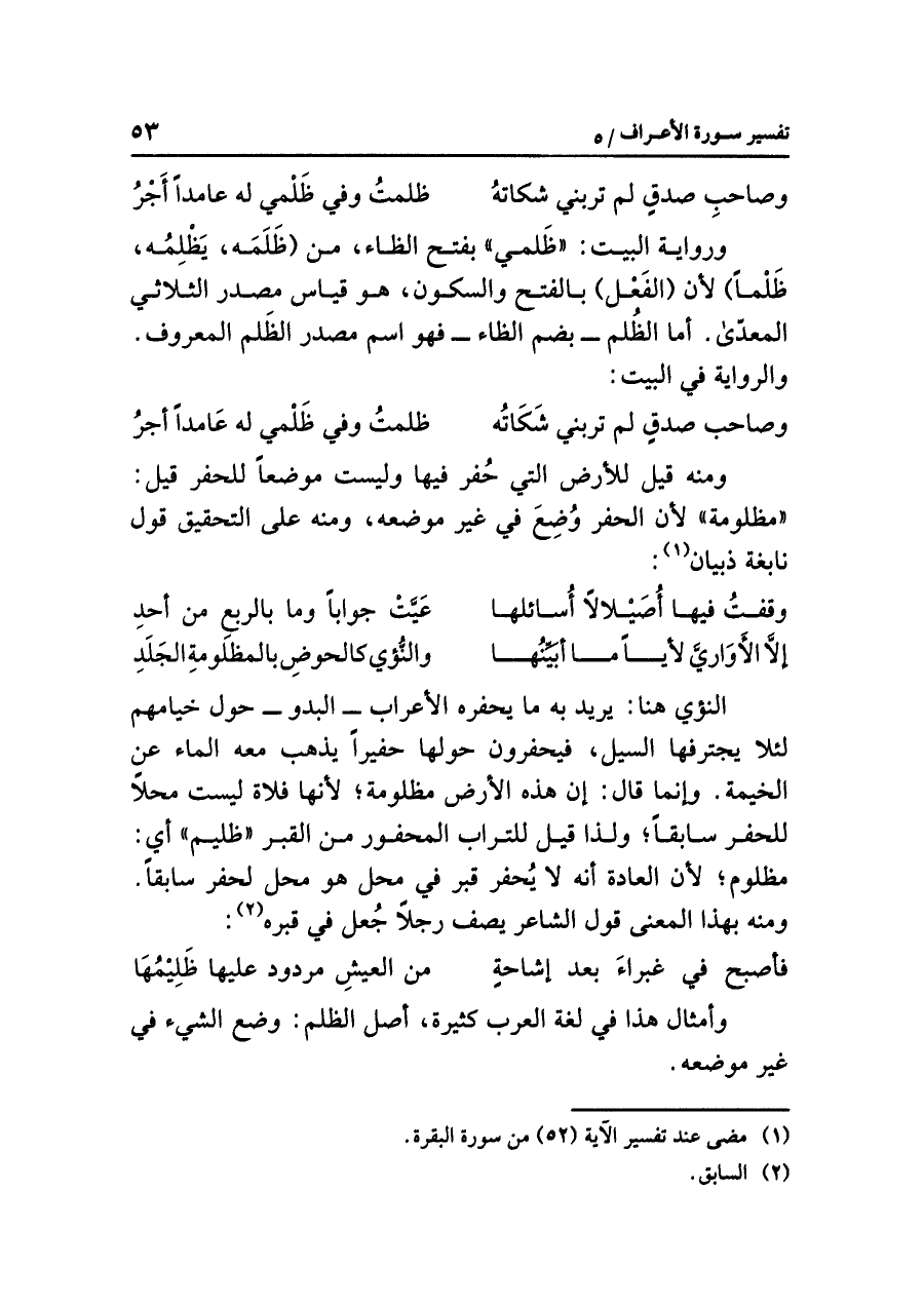 النؤي هنا: يريد به ما يحفره الأعراب -البدو- حول خيامهم لِئَلا يجترفها السيل، فيحفرون حولها حفيراً يذهب معه الماء عن الخيمة، وإنما قال: إن هذه الأرض مظلومة؛ لأنها فلاة ليست محلاّ للحفر سابقاً؛ ولذا قيل للتراب المحفور من القبر (ظليم) أي: مظلوم؛ لأن العادة أنه لا يُحفر قبر في محل هو محل لحفر سابقاً؛ ومنه بهذا المعنى قول الشاعر يصف رجلاً جُعل في قبره (¬٢):