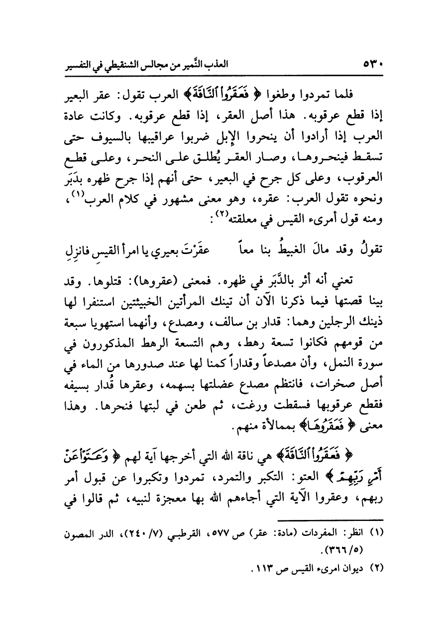 فَلَمَّا تَمَرَّدُوا وَطَغَوْا {فَعَقَرُوا النَّاقَةَ} العربُ تقولُ: عَقَرَ البعيرَ إما قَطَعَ عرقوبَه. هذا أصلُ العقرِ، إذا قطعَ عرقوبَه. وكانت عادةُ العربِ إذا أرادوا أن يَنْحَرُوا الإبلَ ضربوا عراقيبَها بالسيوفِ حتى تسقطَ فينحروها، وصارَ العقرُ يُطلق على النحرِ، وعلى قطعِ العرقوبِ، وعلى كُلِّ جرحٍ في البعيرِ، حتى أنهم إذا جُرِحَ ظهرُه بدَبَرٍ ونحوِه تقولُ العربُ: عَقَرَهُ، وهو معنًى مشهورٌ في كلامِ العربِ (¬١)، ومنه قولُ امرئِ القيسِ في معلقتِه (¬٢):