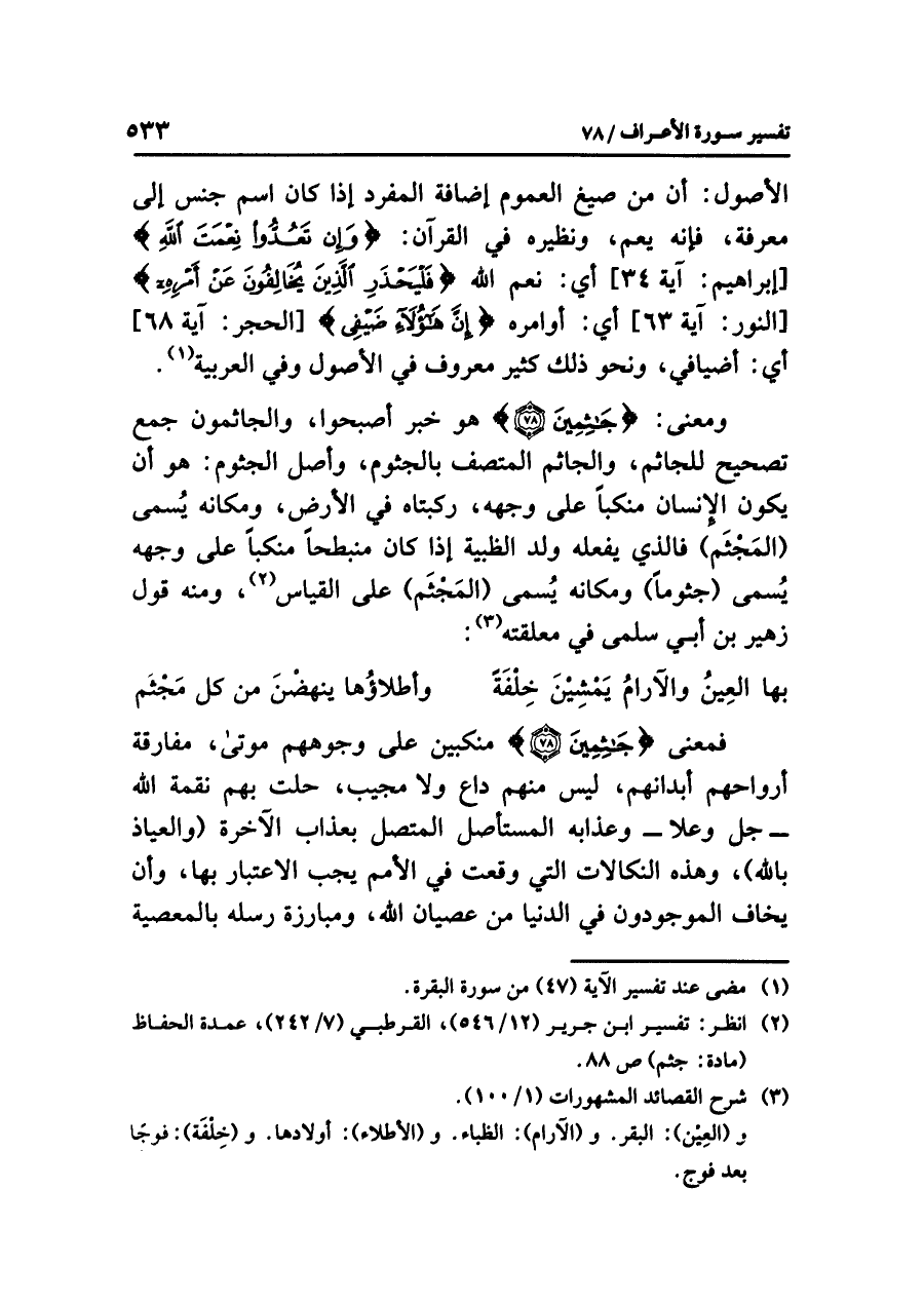 (¬٢) انظر: تفسير ابن جرير (١٢/ ٥٤٦)، القرطبي (٧/ ٢٤٢) عمدة الحفاظ (مادة: جثم) ص٨٨.