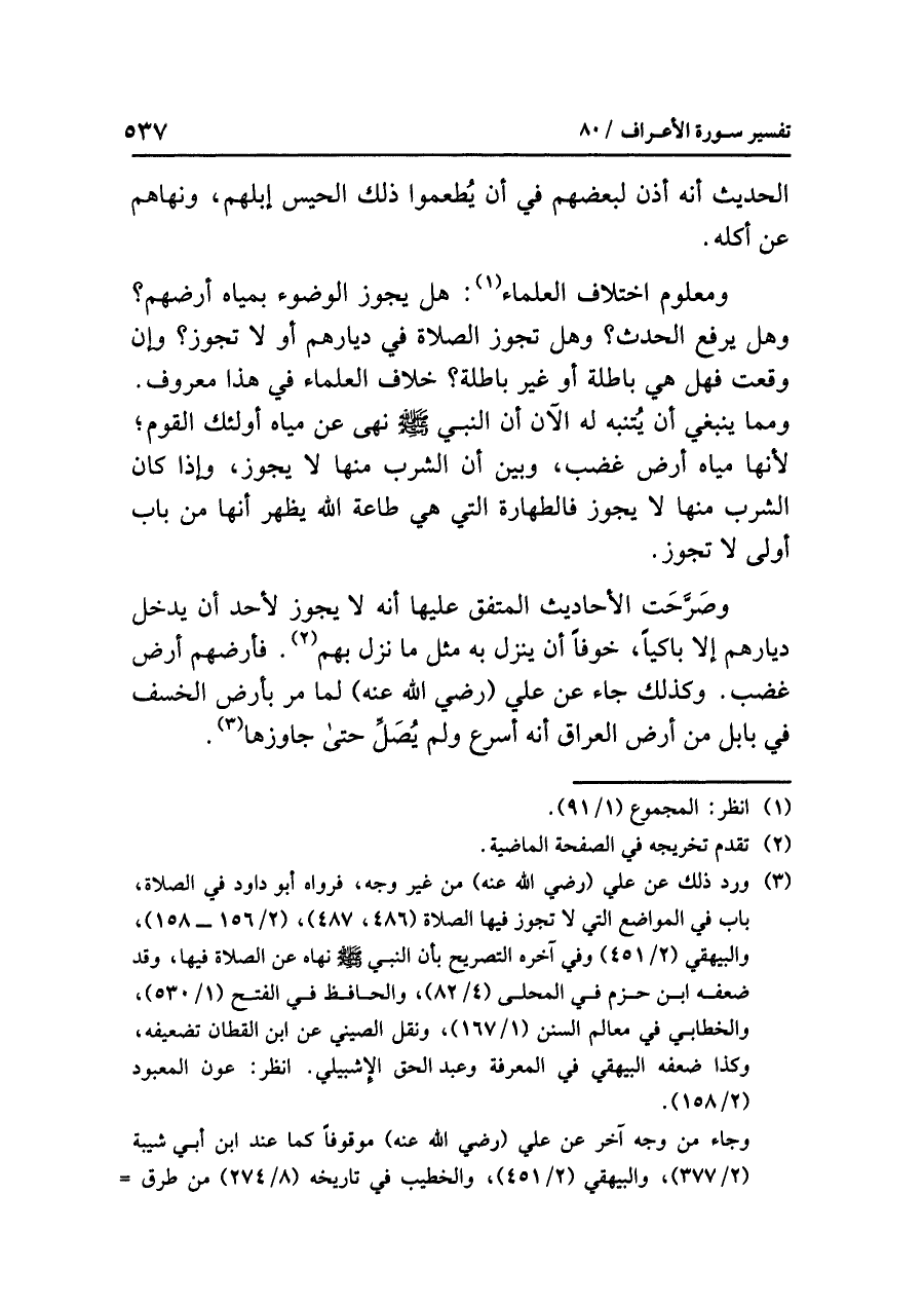 ومعلومٌ اختلافٌ العلماءِ (¬١): هَلْ يجوزُ الوضوءُ بمياهِ أَرْضِهِمْ؟ وهل يرفعُ الحدثَ؟ وهو تجوزُ الصلاةُ في دَيْرِهِمْ أو لا تجوزُ؟ وإن وقعت فهل هي باطلةٌ أو غيرُ باطلةٍ؟ خلافُ العلماء في هذا معروفٌ. ومما ينبغي أن يُتَنَبَّهَ له الآنَ أن النبيَّ صلى الله عليه وسلم نَهَى عن مياهِ أولئك القومِ؛ لأنها مياهُ أرضِ غضبٍ، وَبَيَّنَ أن الشربَ منها لا يجوزُ، وإذا كان الشربُ منها لا يجوزُ فالطهارةُ التي هي طاعةُ اللهِ يظهرُ أنها من بابِ أَوْلَى لا تجوزُ.