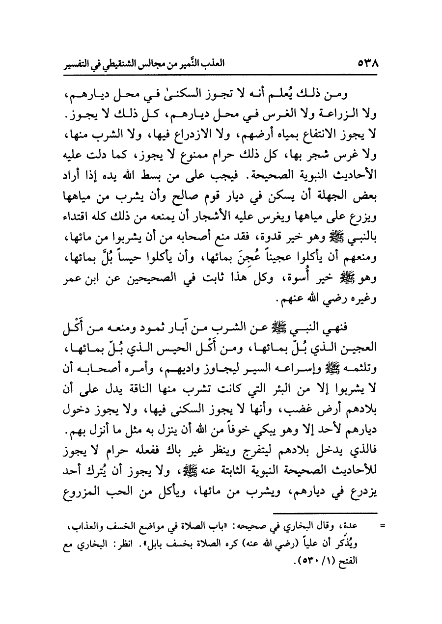 ومن ذلك يُعْلَمُ أنه لا تجوزُ السُّكْنَى في مَحَلِّ ديارِهم، ولا الزراعةُ ولا الغرسُ في محلِّ ديارهم، كُلُّ ذلك لا يجوزُ. لا يجوزُ الانتفاعُ بمياهِ أرضِهم، ولا الازدراعُ فيها، ولا الشربُ منها، ولا غَرْسُ شجرٍ بها، كُلُّ ذلك حرامٌ ممنوعٌ لا يجوزُ، كما دَلَّتْ عليه الأحاديثُ النبويةُ الصحيحةُ. فيجبُ على مَنْ بَسَطَ اللَّهُ يدَه إذا أرادَ بعضُ الجهلةِ أن يسكنَ في ديارِ قومِ صالحٍ وأن يشربَ من مياهِها ويزرعَ على مياهِها ويغرسَ عليه الأشجارَ أن يمنعَه من ذلك كُلِّهِ اقتداءً بالنبيِّ صلى الله عليه وسلم وهو خيرُ قدوةٍ، فقد مَنَعَ أصحابَه من أن يشربوا من مائِها، وَمَنَعَهُمْ أن يأكلوا عَجِينًا عُجِنَ بمائها، وأن يأكلوا حَيْسًا بُلَّ بمائِها، وهو صلى الله عليه وسلم خَيْرُ أُسوةٍ، وكل هذا ثابتٌ في الصحيحين عن ابنِ عمرَ وغيرِه رضي الله عنهم.