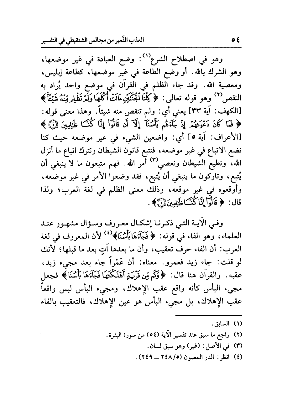 وهو في اصطلاح الشرع (¬١): وضع العبادة في غير موضعها، وهو الشرك بالله. أو وضع الطاعة في غير موضعها، كطاعة إبليس، ومعصية الله. وقد جاء الظلم في القرآن في موضع واحد يُراد به النقص (¬٢) وهو قوله تعالى: {كِلْتَا الْجَنَّتَيْنِ آتَتْ أُكُلَهَا وَلَمْ تَظْلِمْ مِنْهُ شَيْئاً} [الكهف: آية ٣٣] يعني أي: ولم تنقص منه شيئاً. وهذا معنى قوله: {فَمَا كَانَ دَعْوَاهُمْ إِذْ جَاءهُمْ بَأْسُنَا إِلَاّ أَن قَالُواْ إِنَّا كُنَّا ظَالِمِينَ (٥)} [الأعراف: آية ٥] أي: واضعين الشيء في غير موضعه حيث كنا نضع الاتباع في غير موضعه، فنتبع قانون الشيطان ونترك اتباع ما أنزل الله، ونطيع الشيطان ونعصي (¬٣) أمر الله. فهم متبعون ما لا ينبغي أن يُتبع، وتاركون ما ينبغي أن يُتبع، فقد وضعوا الأمر في غير موضعه، وأوقعوه في غير موقعه، وذلك معنى الظلم في لغة العرب. ولذا قال: {قَالُواْ إِنَّا كُنَّا ظَالِمِينَ (٥)}.