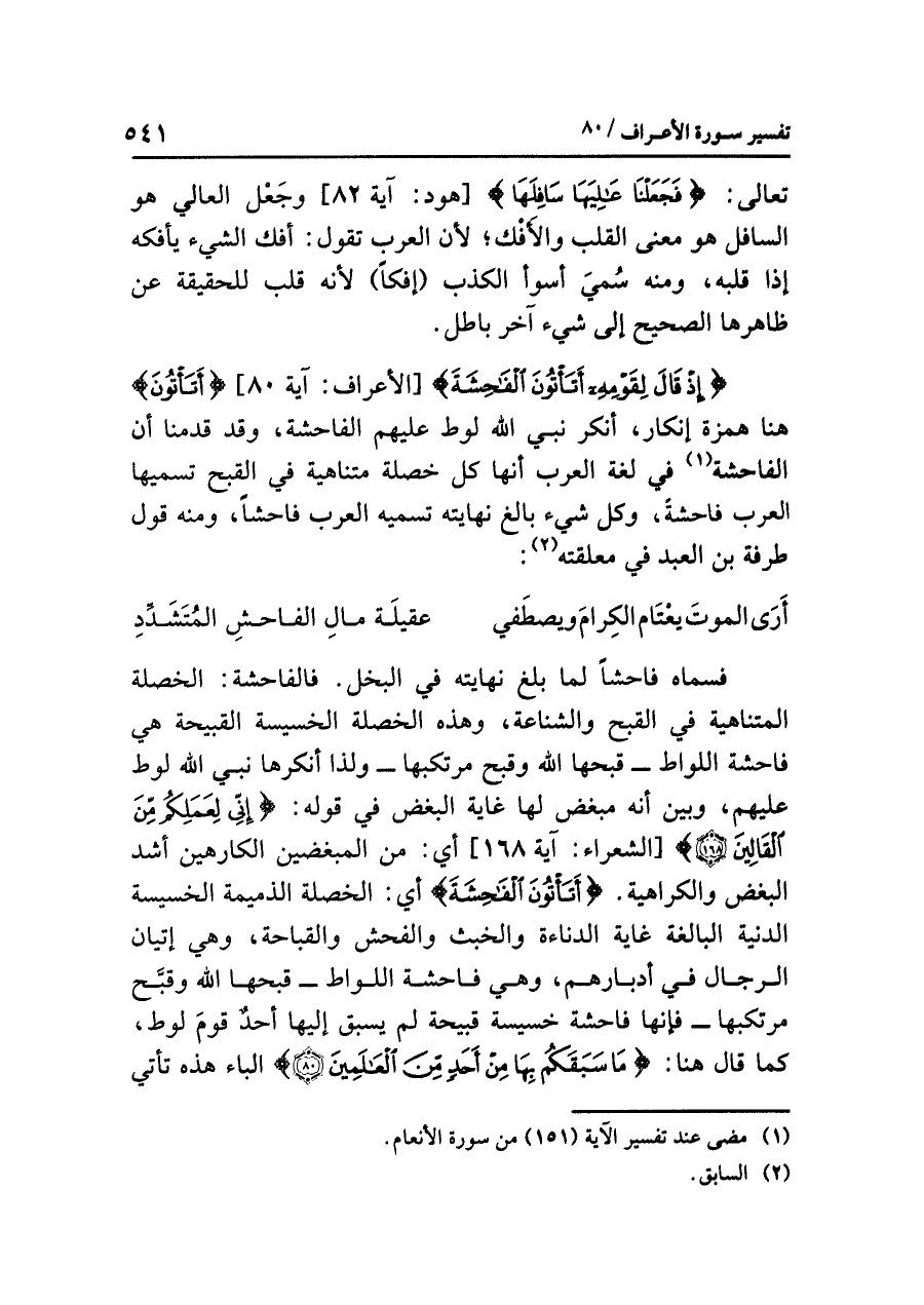 {إِذْ قَالَ لِقَوْمِهِ أَتَأْتُونَ الْفَاحِشَةَ} [الأعراف: آية ٨٠] {أَتَأْتُونَ} هنا همزةُ إنكارٍ، أَنْكَرَ نَبِيُّ اللهِ لوطٌ عليهم الفاحشةَ، وقد قَدَّمْنَا أن الفاحشةَ (¬١) في لغةِ العربِ أنها كُلُّ خصلةٍ متناهيةٍ في القبحِ تُسَمِّيهَا العربُ فاحشة، وكلُّ شيءٍ بالغٍ نهايتَه تُسَمِّيهِ العربُ فاحشًا، ومنه قولُ طرفةَ بنِ العبدِ في معلقتِه (¬٢):