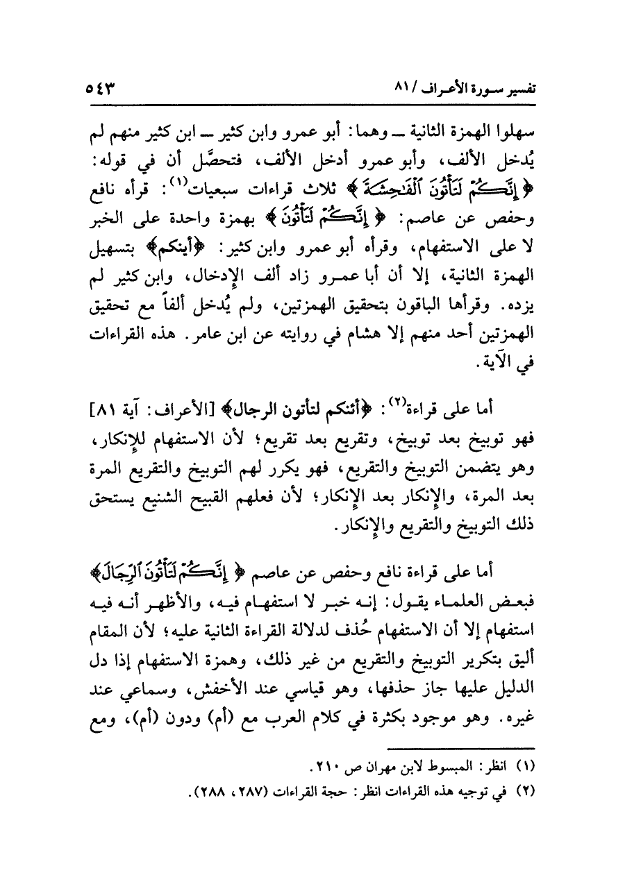 سَهَّلُوا الهمزةَ الثانيةَ - وَهُمَا: أبو عمرٍو وابنُ كثيرٍ - ابنُ كثيرٍ منهم لم يُدْخِلِ الألفَ، وأبو عمرٍو أَدْخَلَ الألفَ، فَتَحَصَّلَ أن في قولِه: {إِنَّكُمْ لَتَأْتُونَ الْفَاحِشَةَ} ثلاثُ قراءاتٍ سبعياتٍ (¬١): قرأه نافعٌ وحفصٌ عن عاصمٍ: {إِنَّكُمْ لَتَأْتُونَ} بهمزةٍ واحدةٍ على الخبرِ لَا على الاستفهامِ، وقرأه أبو عمرٍو وابنُ كثيرٍ: {أَينَّكُمْ} بتسهيلِ الهمزةِ الثانيةِ، إلا أن أَبَا عمرٍو زَادَ ألفَ الإدخالِ، وابنُ كثيرٍ لم يَزِدْهُ. وقرأها الباقونَ بتحقيقِ الهمزتين، ولم يُدْخِلْ أَلِفًا معَ تحقيقِ الهمزتين أحدٌ منهم إلا هشامٌ فِي روايتِه عن ابنِ عَامِرٍ. هذه القراءاتُ في الآيةِ.