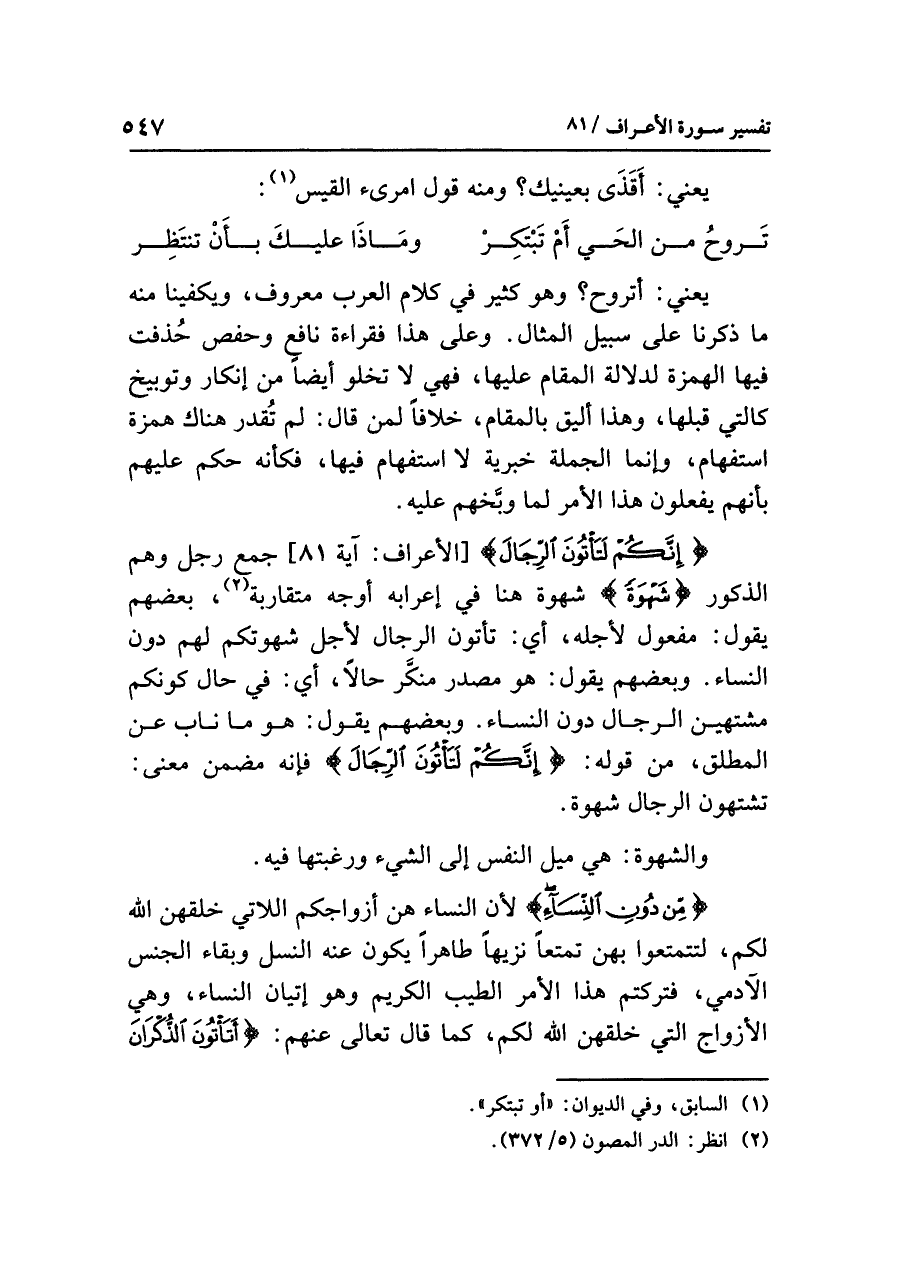 {إِنَّكُمْ لَتَأْتُونَ الرِّجَالَ} [الأعراف: آية ٨١] جَمْعُ رَجُلٍ وهم الذكورُ {شَهْوَةً} شهوةً هنا في إعرابِه أَوْجُهٌ متقاربةٌ (¬٢)، بعضُهم يقولُ: مفعولٌ لأَجْلِهِ، أي: تأتونَ الرجالَ لأجلِ شهوتِكم لهم دونَ النساءِ. وبعضُهم يقول: هو مصدرٌ مُنَكَّرٌ حالاً، أي: في حالِ كونِكم مُشْتَهِينَ الرجالَ دونَ النساءِ. وبعضُهم يقولُ: هو ما نَابَ عن المطلقِ من قوله: {إِنَّكُمْ لَتَأْتُونَ الرِّجَالَ} فإنه مُضَمَّنٌ معنَى: تشتهونَ الرجالَ شهوةً.